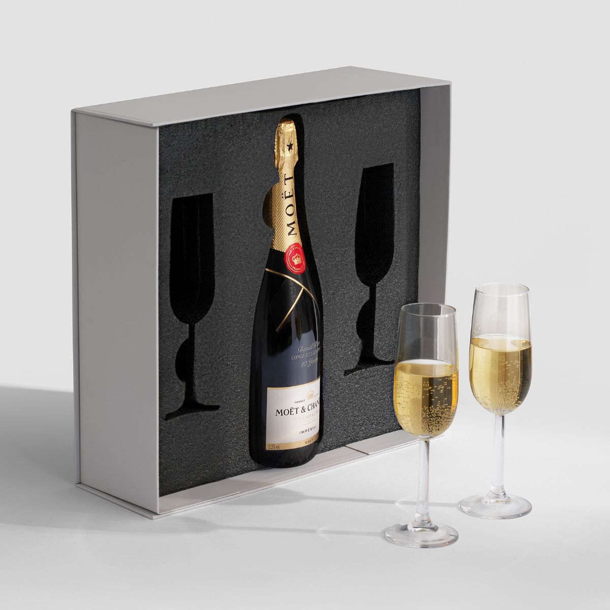 This luxury corporate gift hamper pairs a bottle of premium Champagne with two Dartington Crystal flutes, beautifully presented in a premium gift box personalised with your company branding. The perfect way to say thank you and celebrate success this Christmas.