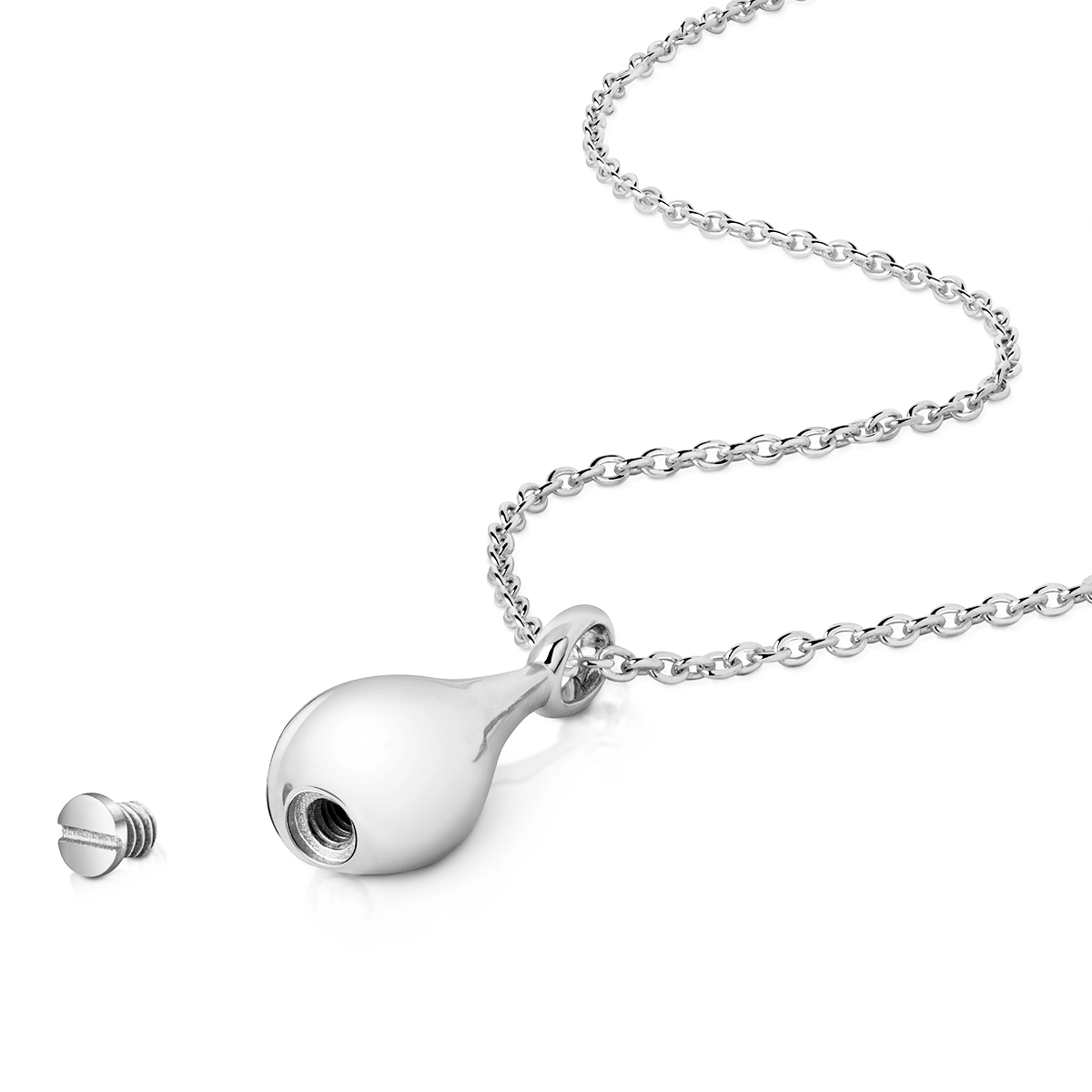 The smooth, fluid form of the pendant is inspired by the purity of a single water droplet, symbolising the enduring flow of life. A secure screw mechanism ensures the ashes are safely kept inside.