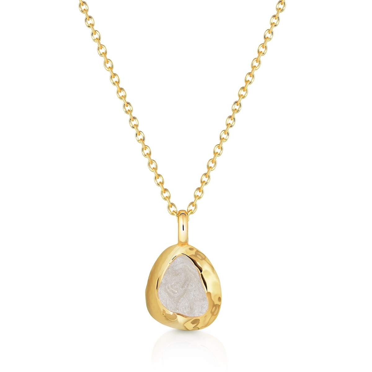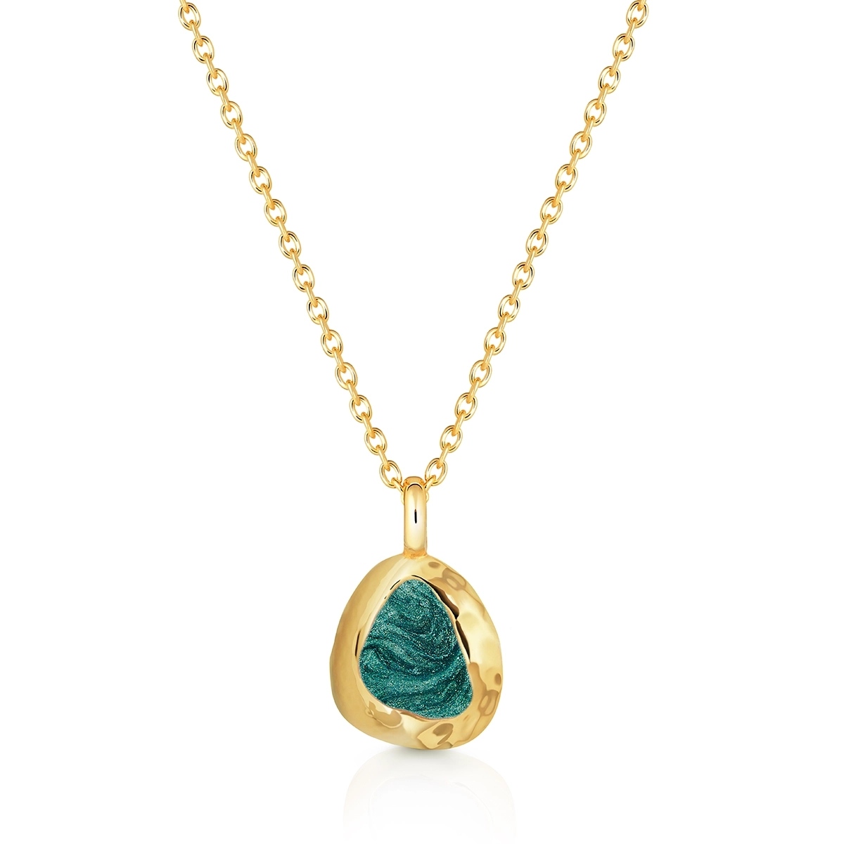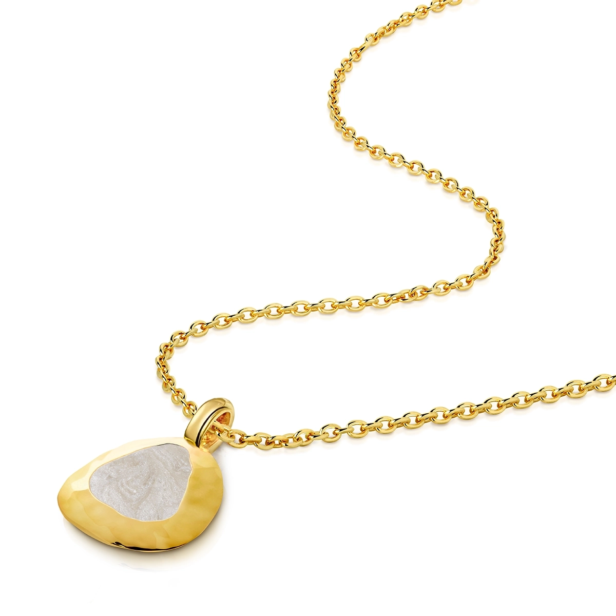 Crafted from 925 sterling silver and plated in 18k gold, this distinctive pendant features an organic pebble shape with a molten-style finish that feels both contemporary and timeless.