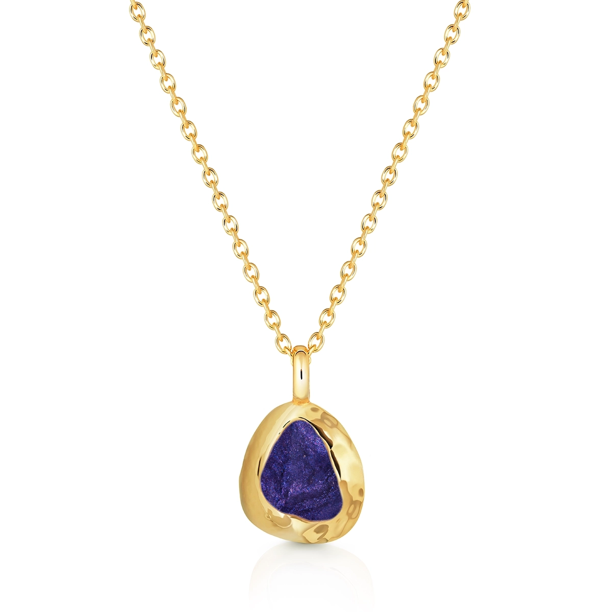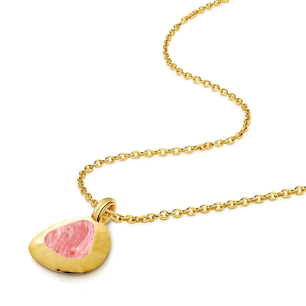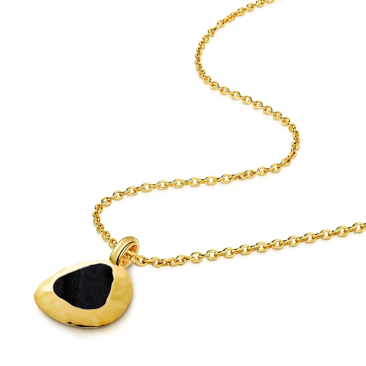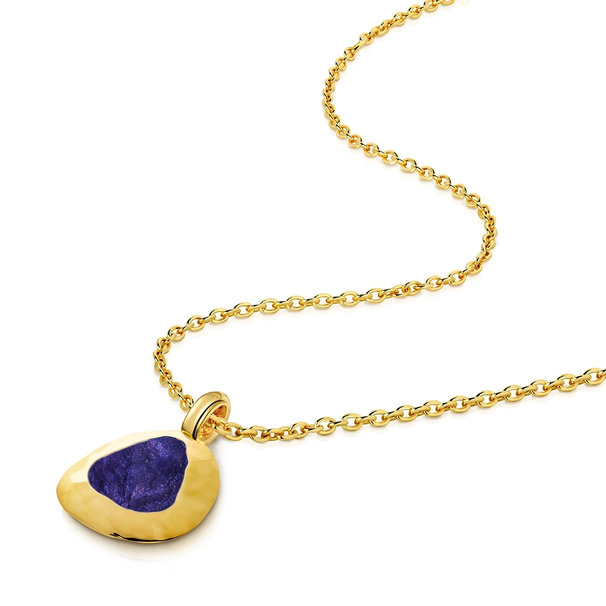 Crafted from 925 sterling silver and plated in 18k gold, this distinctive pendant features an organic pebble shape with a molten-style finish that feels both contemporary and timeless.