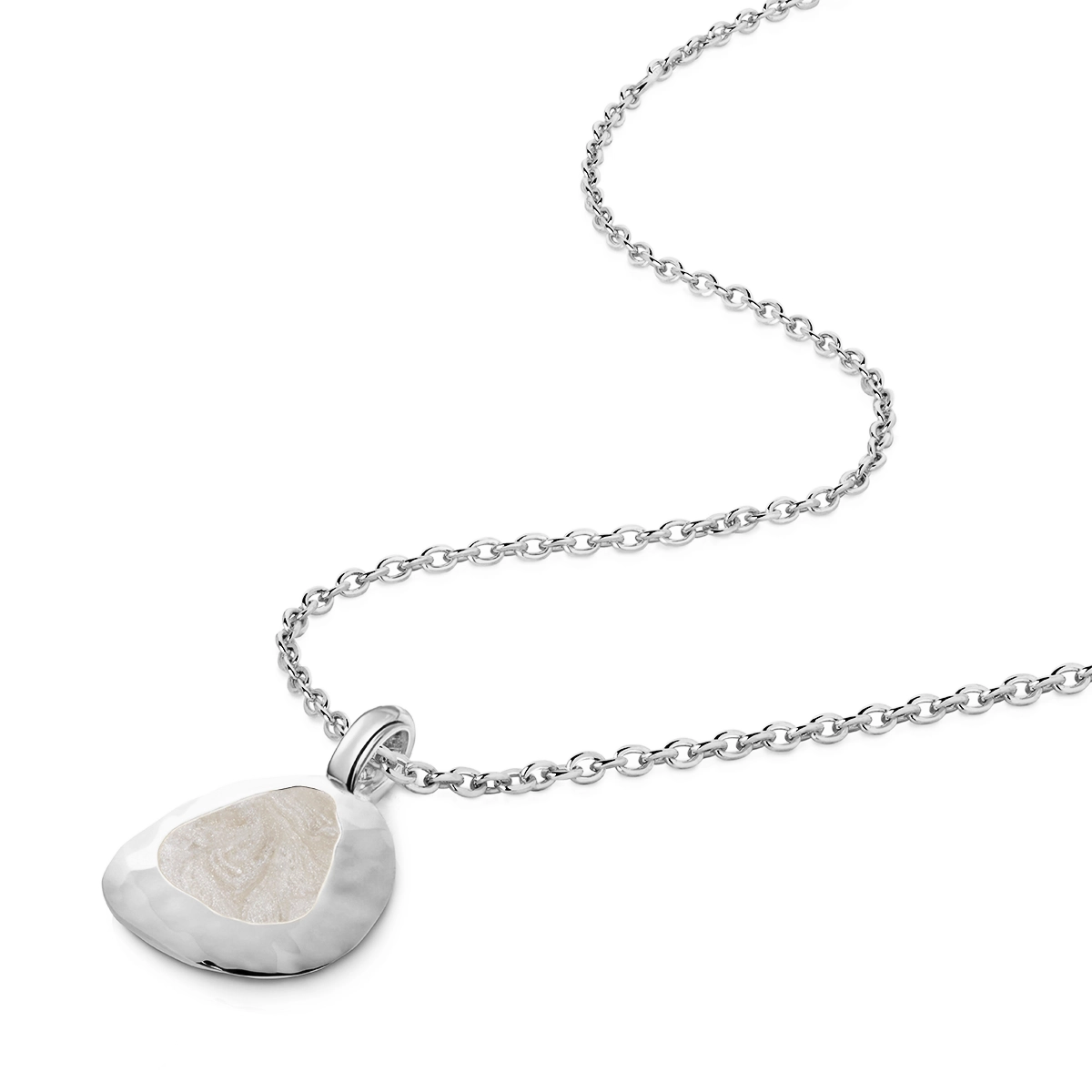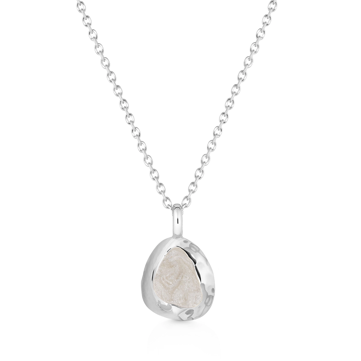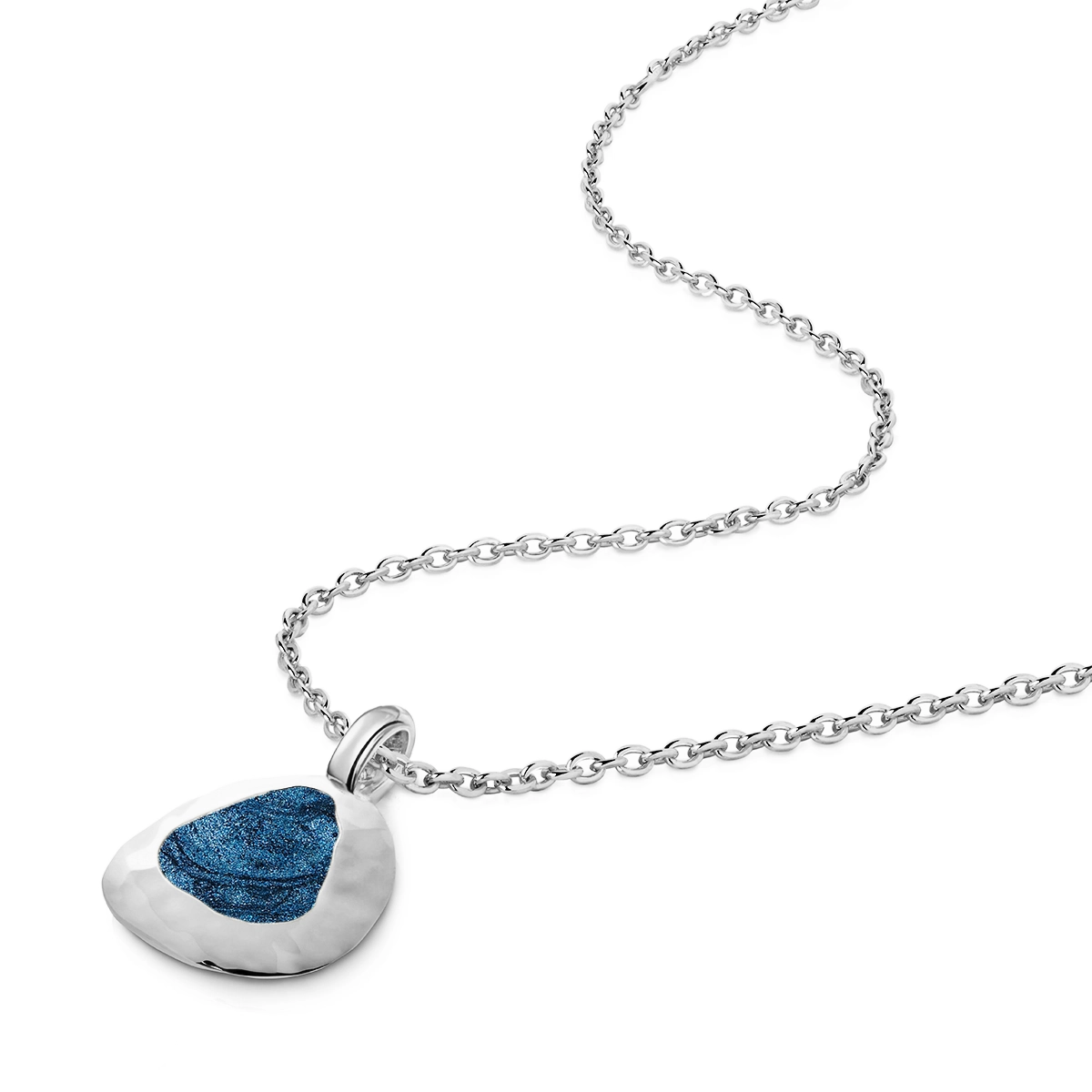 Crafted from 925 sterling silver, this distinctive pendant features an organic pebble shape with a molten-style finish that feels both contemporary and timeless.