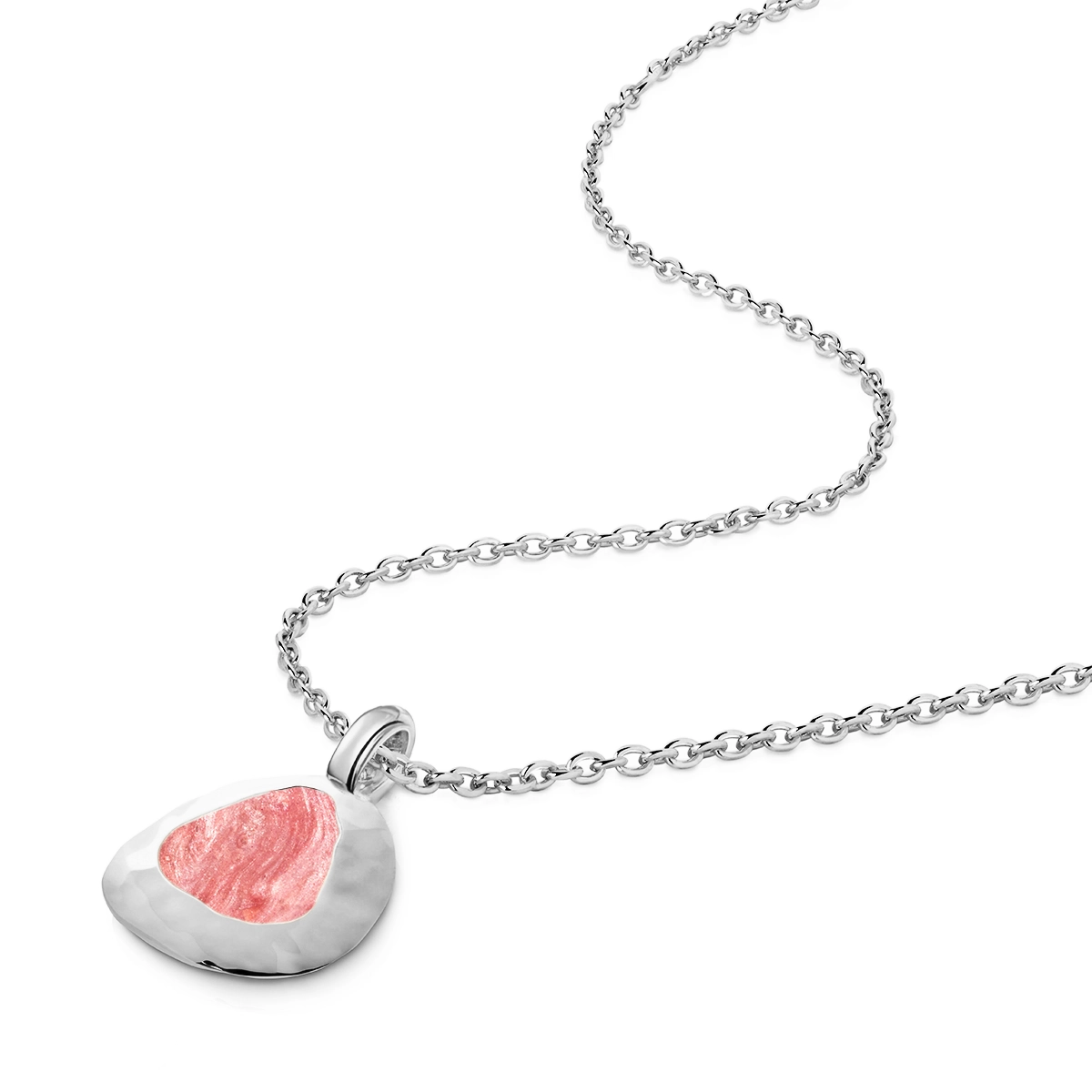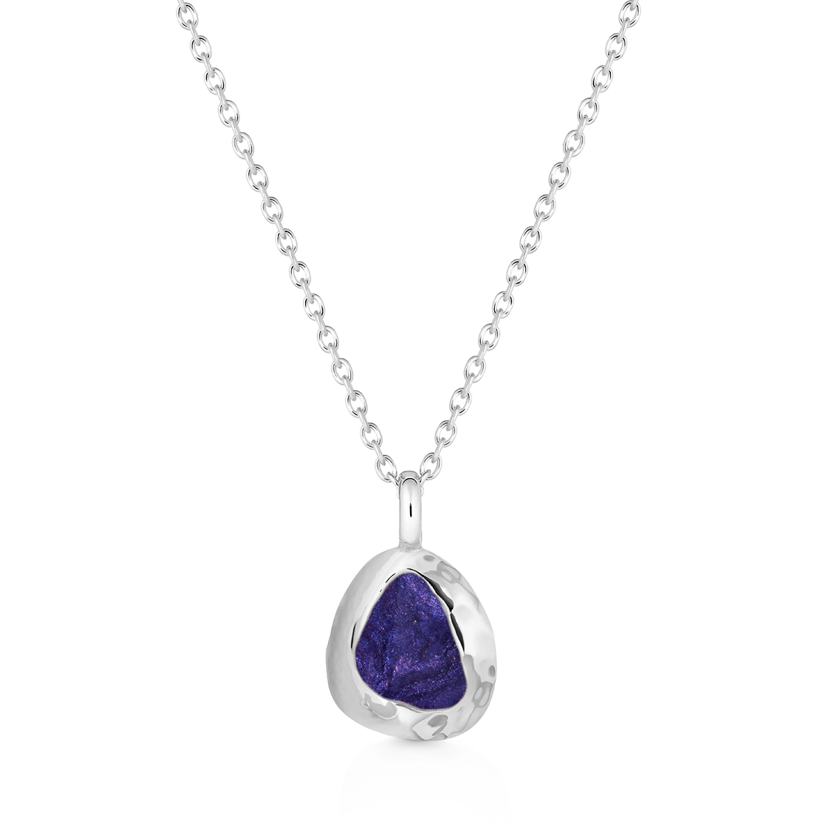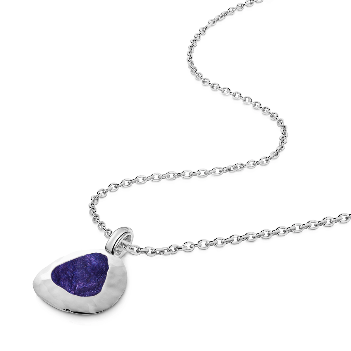Crafted from 925 sterling silver, this distinctive pendant features an organic pebble shape with a molten-style finish that feels both contemporary and timeless.