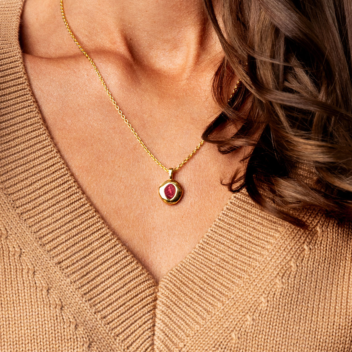The pendant is suspended from a sterling silver trace chain plated in 18k gold, adjustable to 16–18 inches, or available with an upgraded length of 20–22–24 inches for the perfect fit.