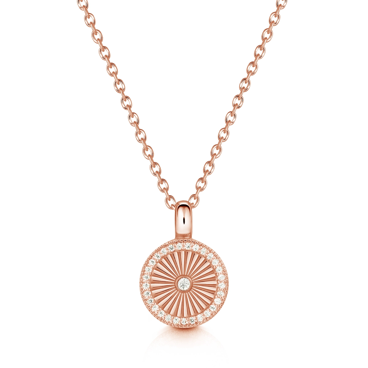 This round urn necklace combines a radiant design with a deeply personal purpose. Crafted from 925 sterling silver and plated in 18k rose gold, the pendant features a sunburst pattern set with a central crystal, framed by a shimmering halo of stones.