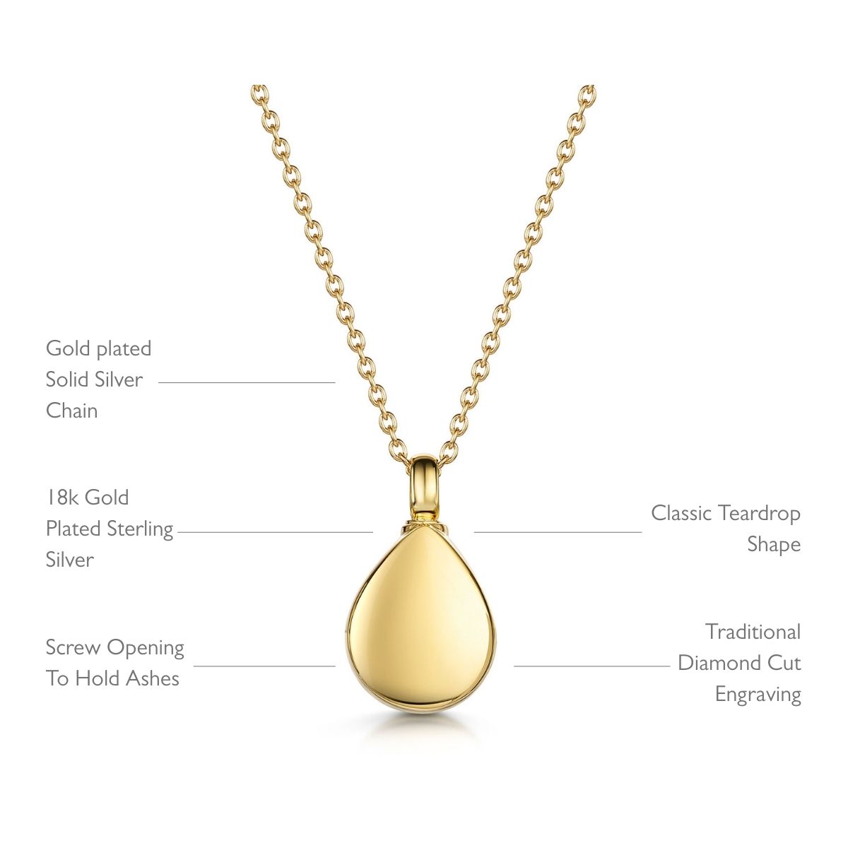 Gold teardrop memorial urn necklace from Lovelox with screw opening for holding cremation ashes. This heartfelt ashes necklace is a beautiful and meaningful way to remember your loved one. Crafted with the utmost care, this exquisitely designed necklace is made from 18K gold plated solid 925 sterling silver. Keeping the memory of your beloved close to your heart, this wonderfully finished memorial necklace keeps their precious ashes protected at all times. A timeless diamond-cut engraving adds a personal touch, reflecting your deepest sentiments.