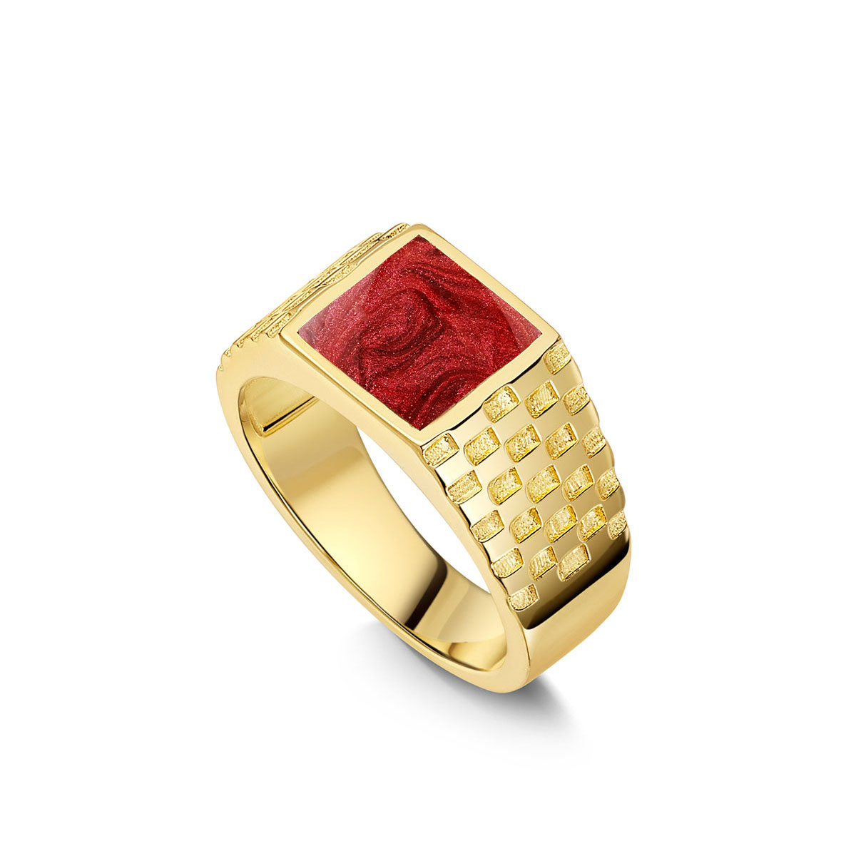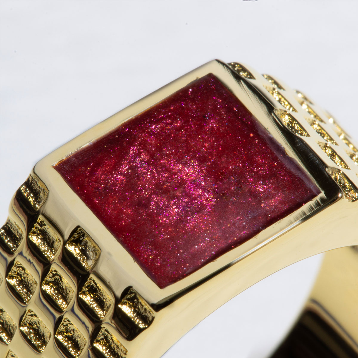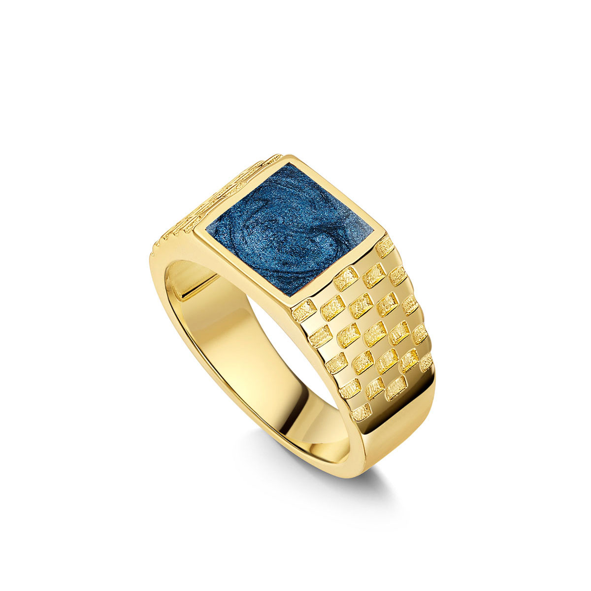 Crafted from 925 sterling silver plated with 18K gold this traditional signet ring from LOVELOX features a square centrepiece and a chequered texture on the band. The centrepiece is made from specialised resin infused with coloured pigment and a small blend of your loved ones ashes resulting in a stunning celestial look.