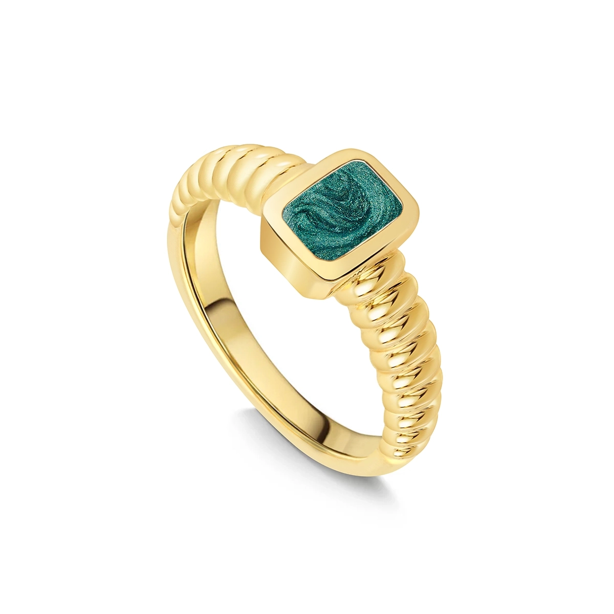 Crafted from 925 sterling silver and finished with 18k gold plating, this ring features a rectangular resin setting framed by a distinctive ribbed band. The softly contoured shape ensures a comfortable fit for daily wear.