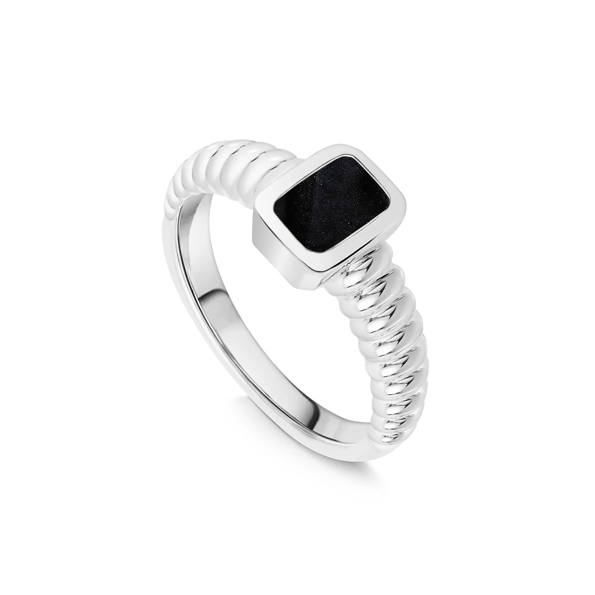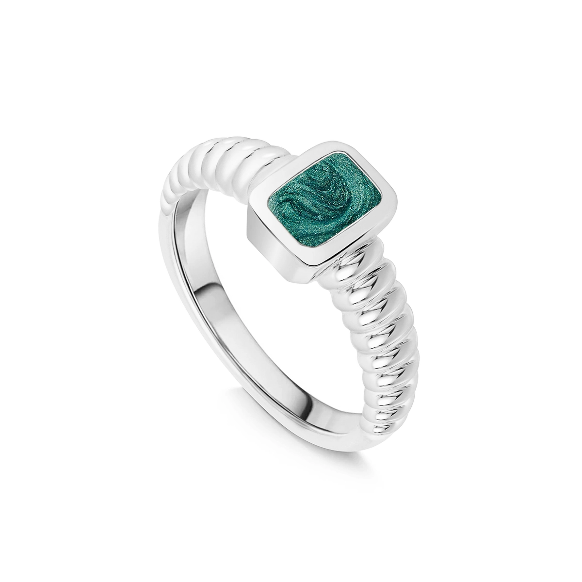 Crafted from 925 sterling silver, this ring features a rectangular resin setting framed by a distinctive ribbed band. The softly contoured shape ensures a comfortable fit for daily wear.