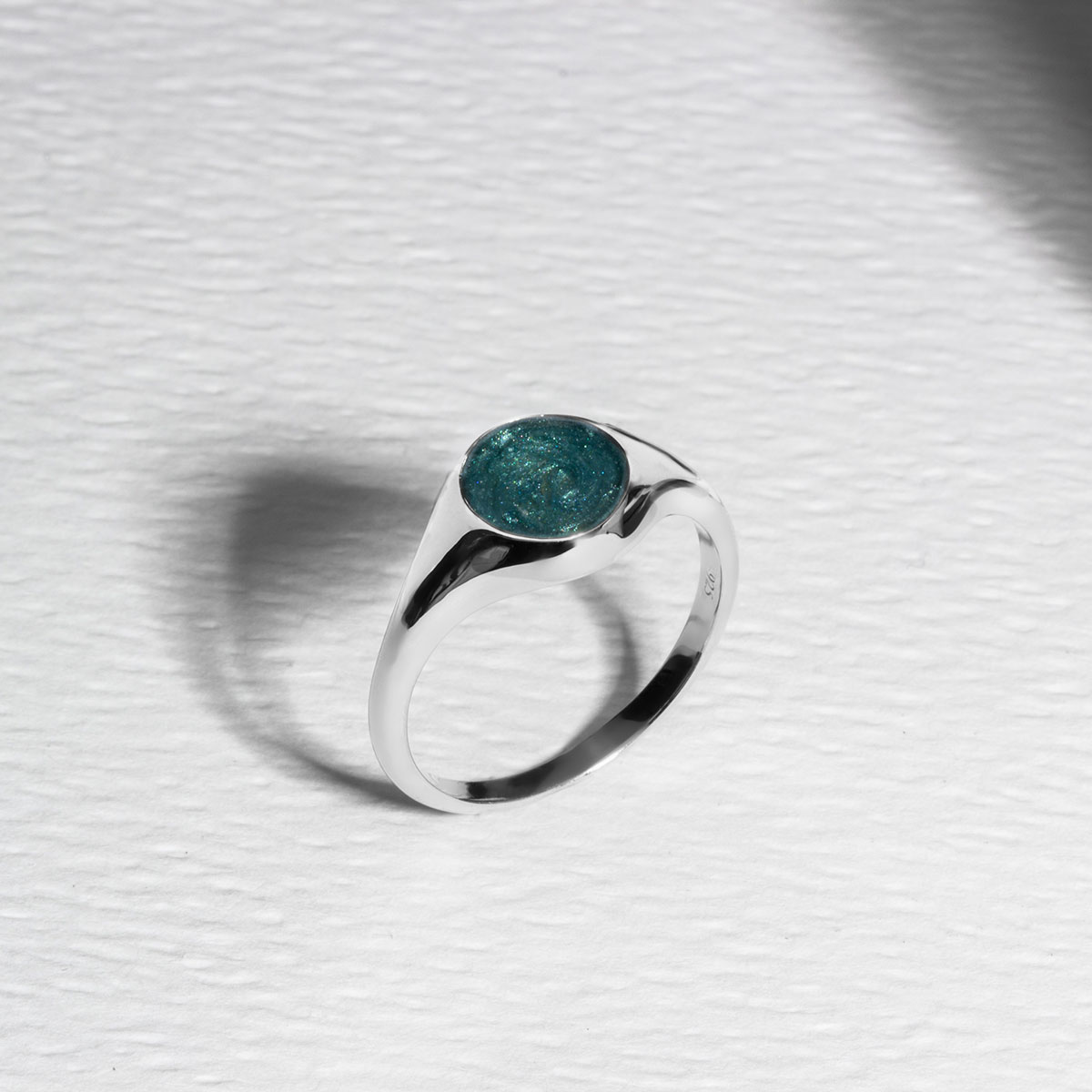 Crafted from 925 sterling silver this traditional signet ring from LOVELOX features a round centrepiece. The centrepiece is made from specialised resin infused with coloured pigment and a small blend of your loved ones ashes resulting in a stunning celestial look.