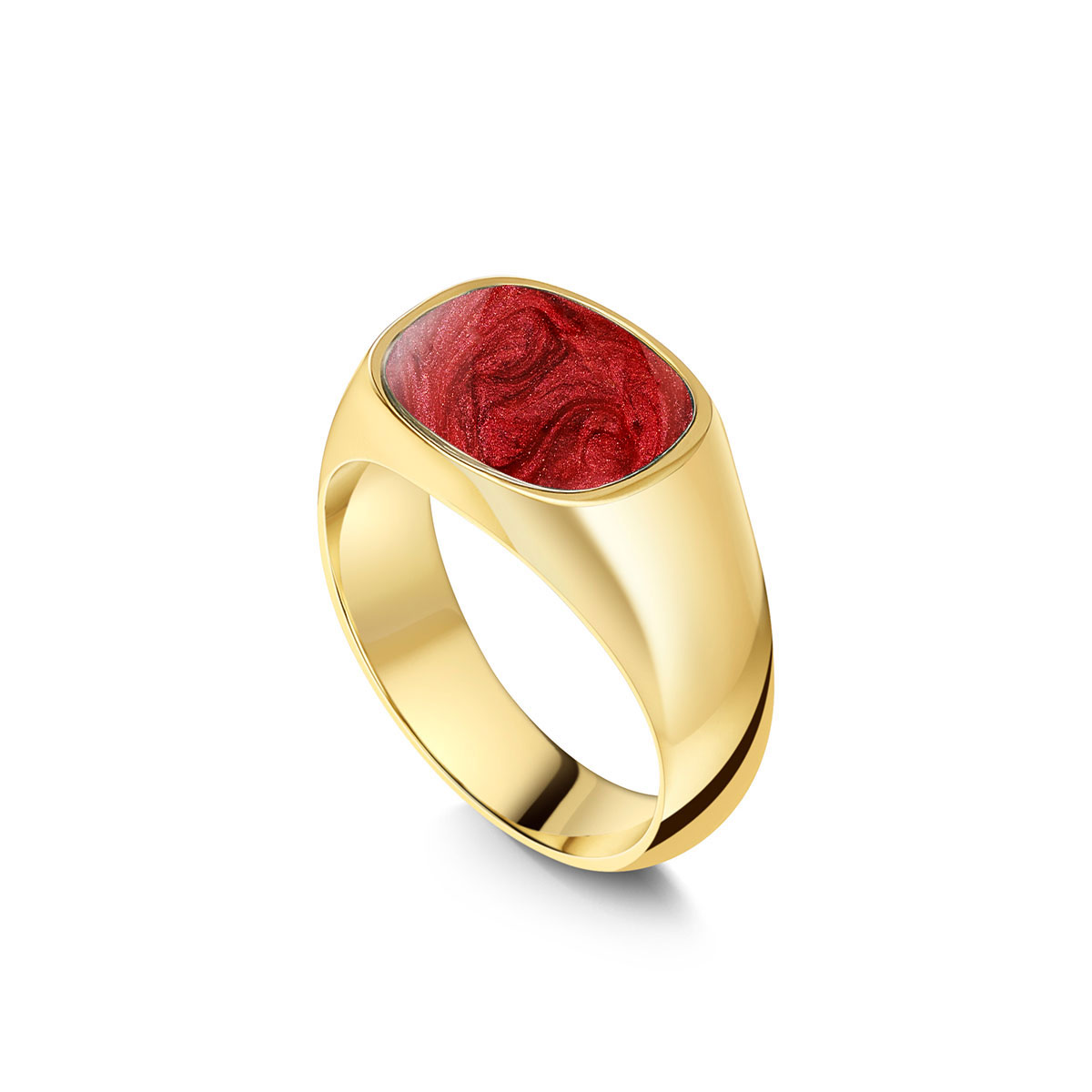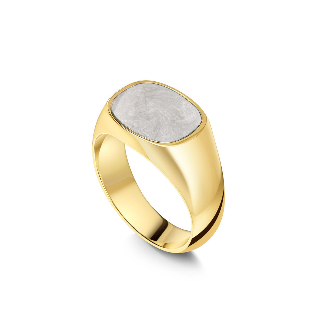 Crafted from 925 sterling silver plated with 18K gold this contemporary signet ring from LOVELOX features a rounded rectangular centrepiece. The centrepiece is made from specialised resin infused with coloured pigment and a small blend of your loved ones ashes resulting in a stunning celestial look.