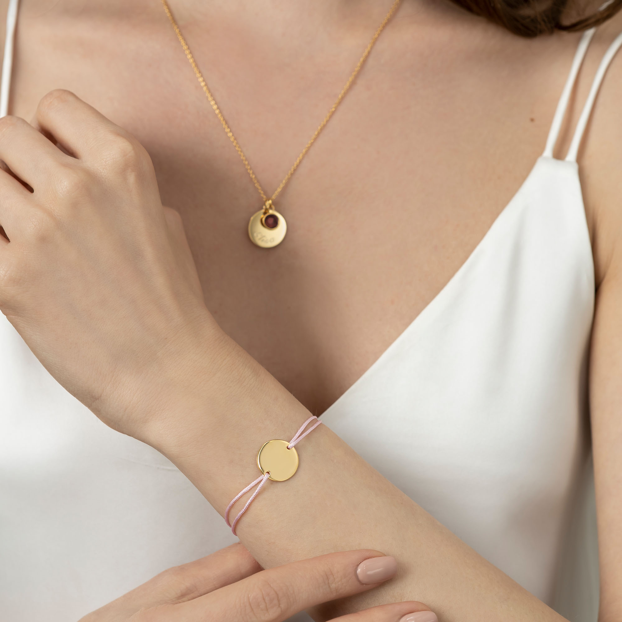 Gold plated solid silver disc personalised friendship bracelet with pink luxury cord. This gold engraved bracelet from MYRI London is bright and full of fun, creating a beautiful personalised gift for a special moment. The disc is the perfect stage to showcase a name or date, carefully engraved on the curve of the circle.