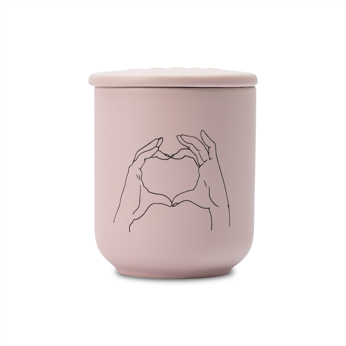 A 100% sustainable soy wax candle with a British made fragrance of rich embers and enfused with musk. Make this candle the perfect gift for any occasion, with a personal message engraved on the reverse of the vessel. Precision laser engraving creates a beautiful impression. This candle is designed and poured in the UK, with a modern pink jar adorned with hands creating a heart shape, that can be repurposed once the candle is used.