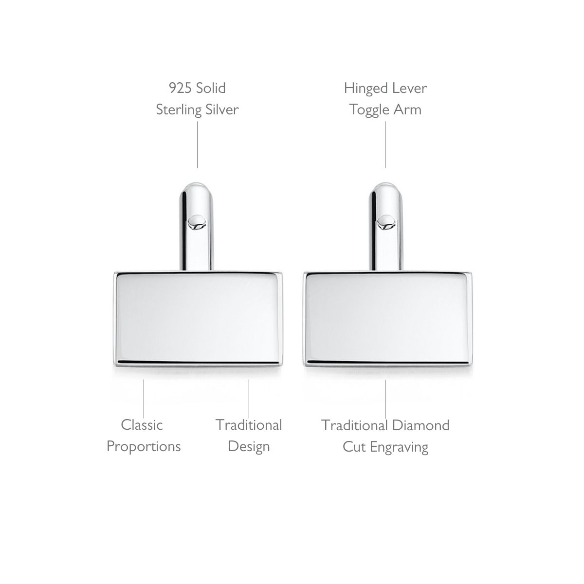 Solid silver rectangle personalised cufflinks engraved with custom message for him. Clean lines and classic proportions define this ever-popular style of cufflinks, making them a staple for every man’s wardrobe. The cufflinks feature a hinged lever toggle arm, all made in the highest quality solid 925 sterling silver.