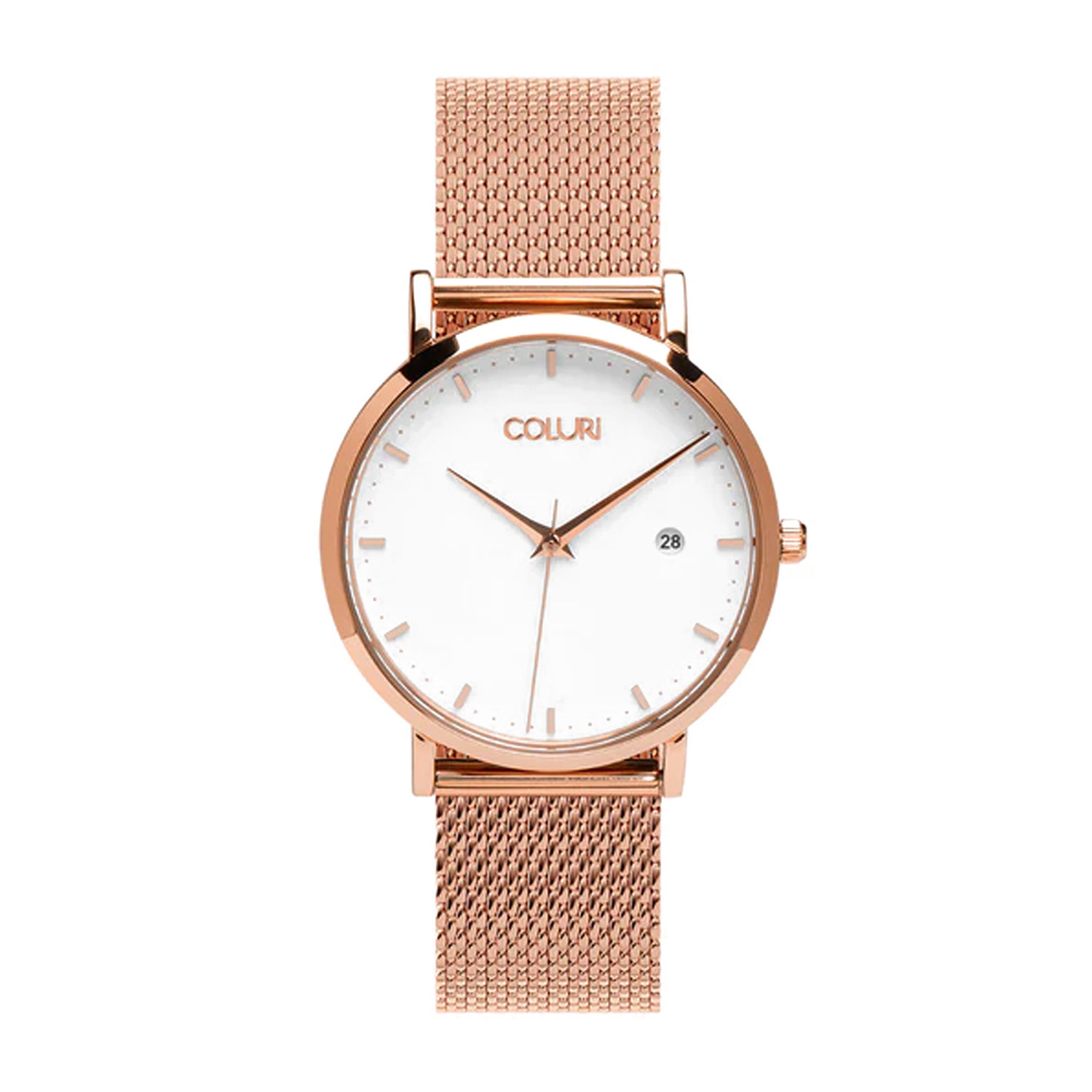 Rose gold and white Kahlo watch from Coluri. Featuring Japanese Miyota Quartz movement, this timepiece is designed to lift your spirits and inspire. Crafted from 18K rose gold plated stainless steel with sapphire scratch resistant protection on the glass, this watch is made to last.