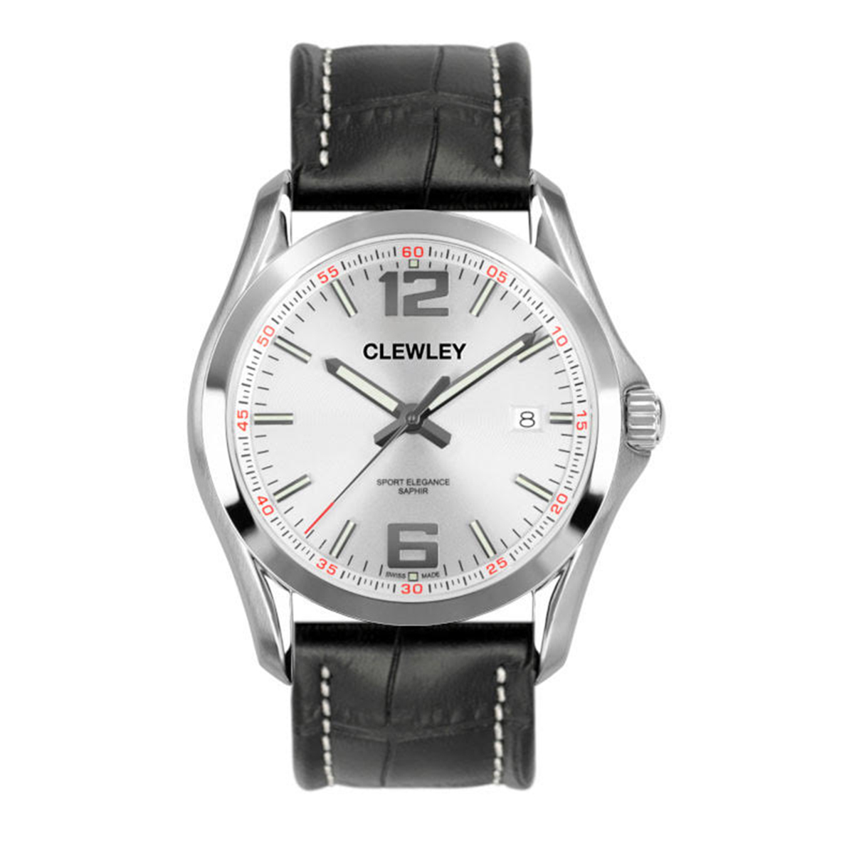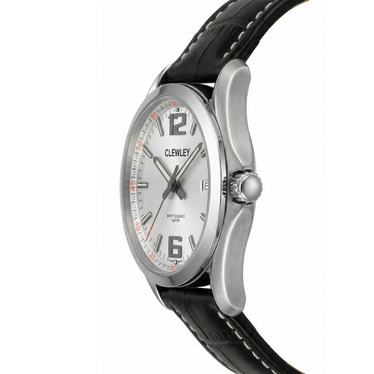 The Clewley Sport watch blends contemporary British design with the precision and heritage of Swiss watchmaking. Designed in England and crafted in Switzerland, this refined timepiece houses a high-accuracy quartz movement, delivering reliable performance for everyday wear. Its clean silver dial features bold applied numerals, luminous hands, and subtle red minute markers, offering excellent readability with a modern sporting edge.