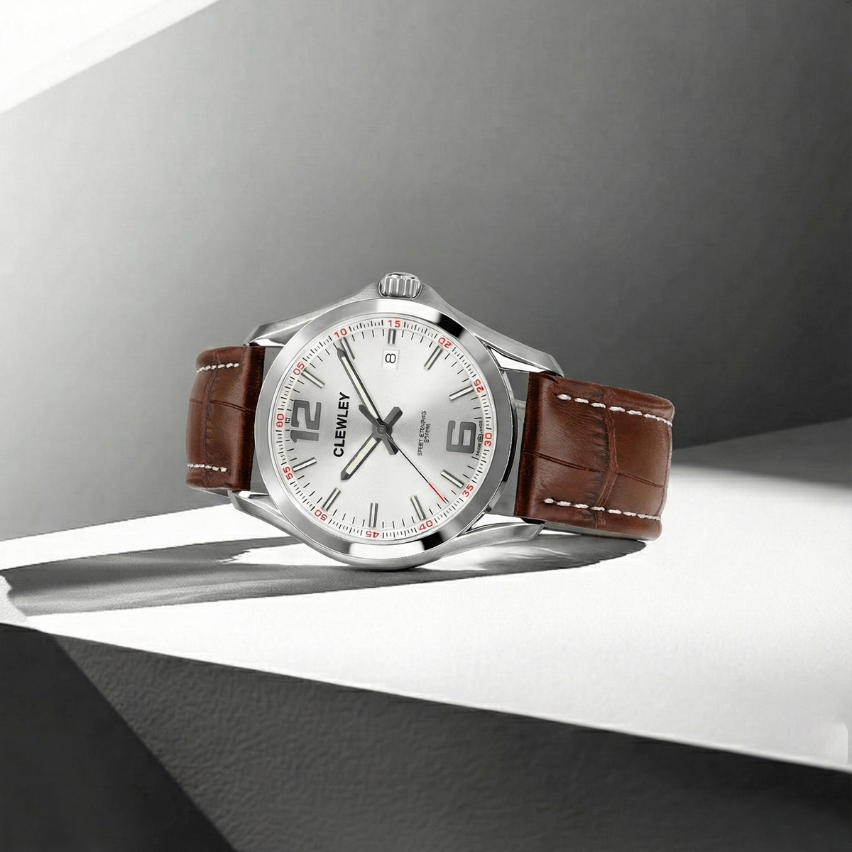 The Clewley Sport watch blends contemporary British design with the precision and heritage of Swiss watchmaking. Designed in England and crafted in Switzerland, this refined timepiece houses a high-accuracy quartz movement, delivering reliable performance for everyday wear. Its clean silver dial features bold applied numerals, luminous hands, and subtle red minute markers, offering excellent readability with a modern sporting edge.