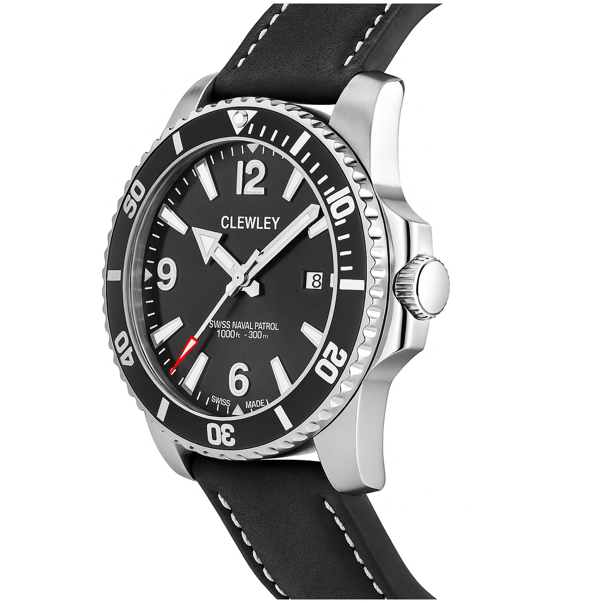 The Clewley Submariner is a professional-grade diver’s watch engineered for reliability, clarity, and strength in the most demanding conditions. Designed in England and made in Switzerland, it features a precision quartz movement for exceptional accuracy and ultra-low maintenance, making it a dependable companion both above and below the surface. The scratch-resistant sapphire crystal ensures maximum durability, preserving perfect visibility of the bold markers, luminous hands, and clean black dial.