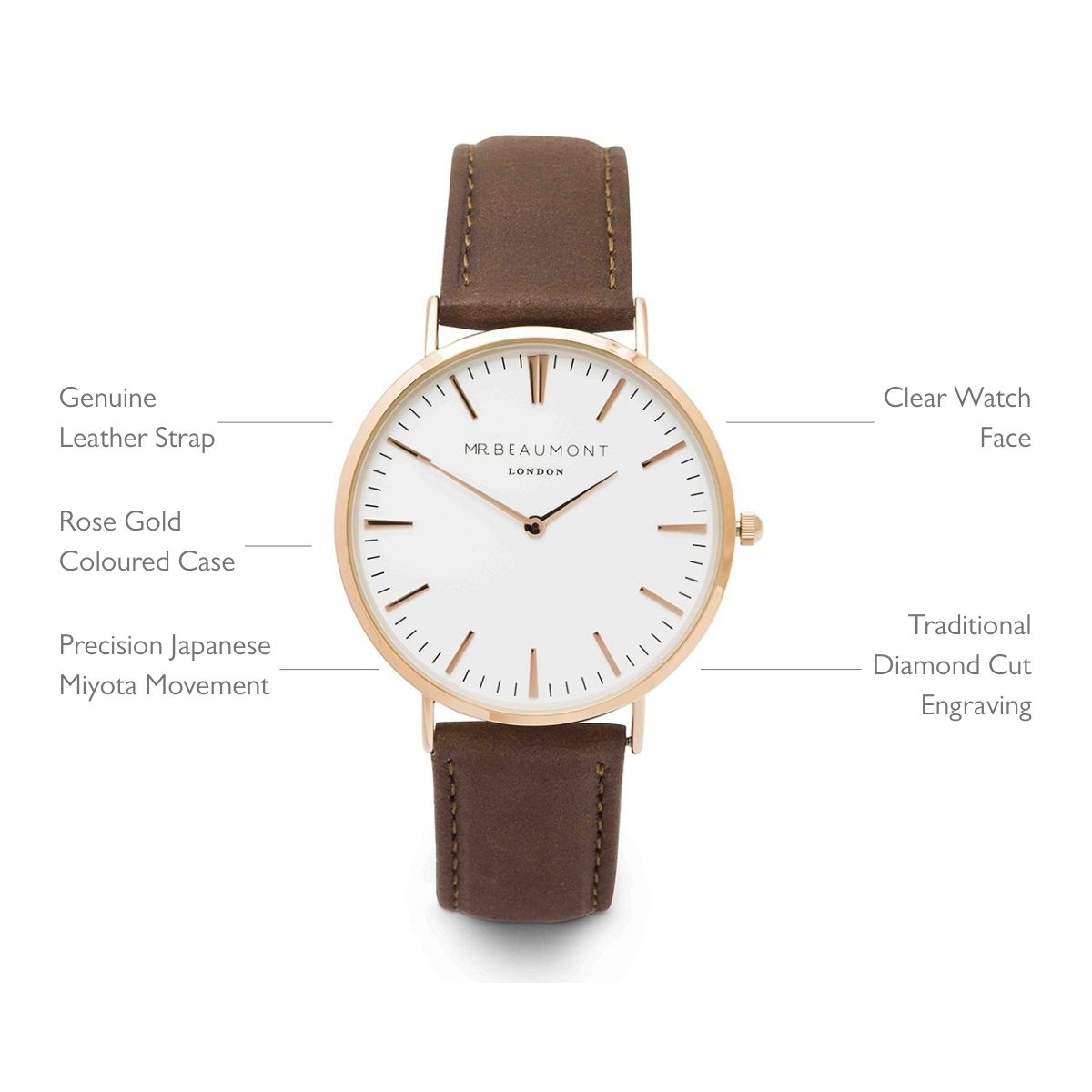 Engraved watch from Mr Beaumont with quintessential classic styling of a polished rose gold case with brown leather strap. This gent’s timepiece features a large 41mm case with a precision Japanese Miyota movement and water resistance to 3 atmospheres. Delivered in Mr Beaumont signature packaging with a brown leather cover, the watch delivers a masculine and stylish gift experience.
