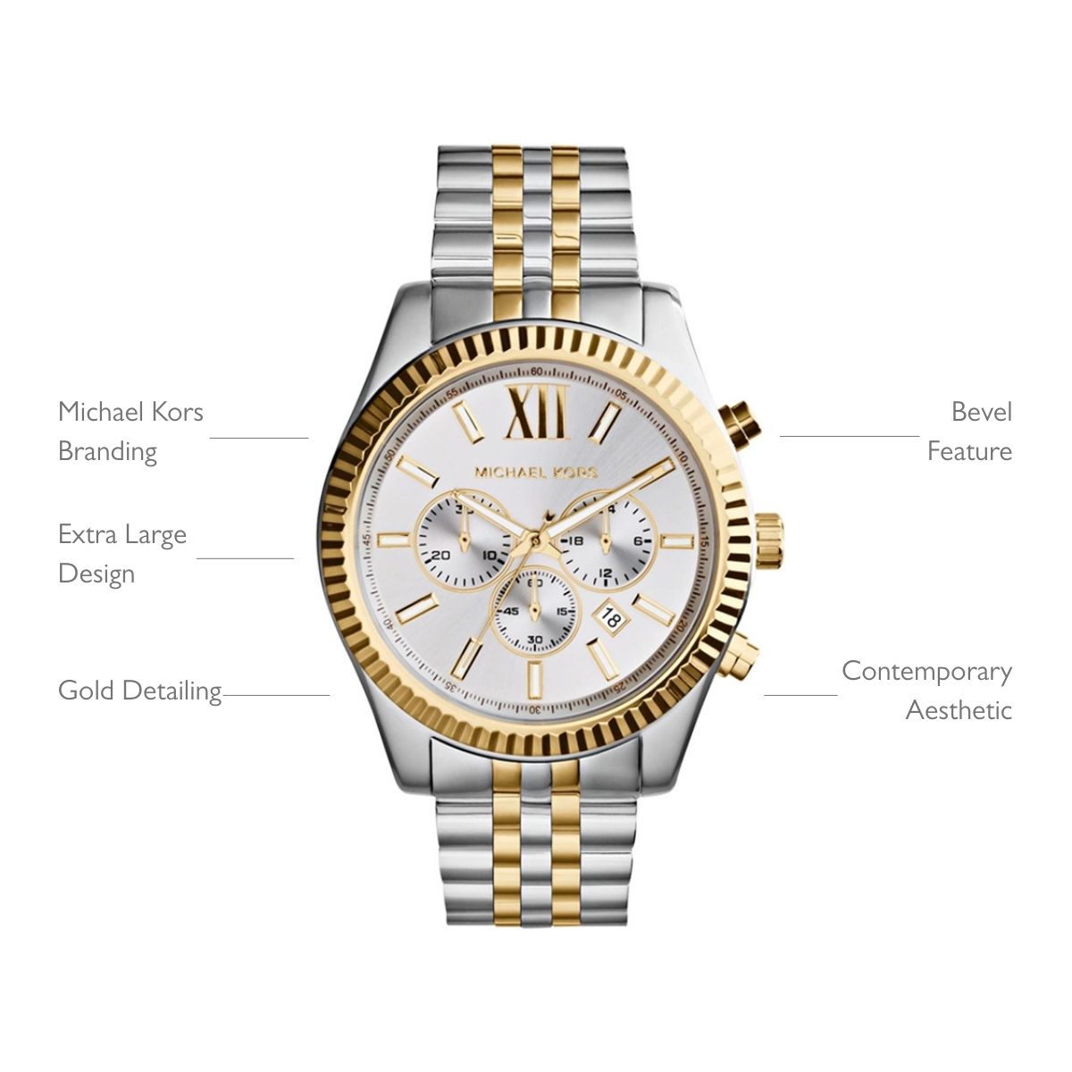 Chunky silver men’s engraved watch with gold detailing from Michael Kors. This extra large timepiece speaks to the design aesthetic of Michael Kors, bringing together masculine styling with eye-catching looks. The feather-cut bevel and gold elements offer a striking watch of contemporary appearance. A diamond-cut engraving on the reverse of the case with a personal message finishes the beautiful gift.