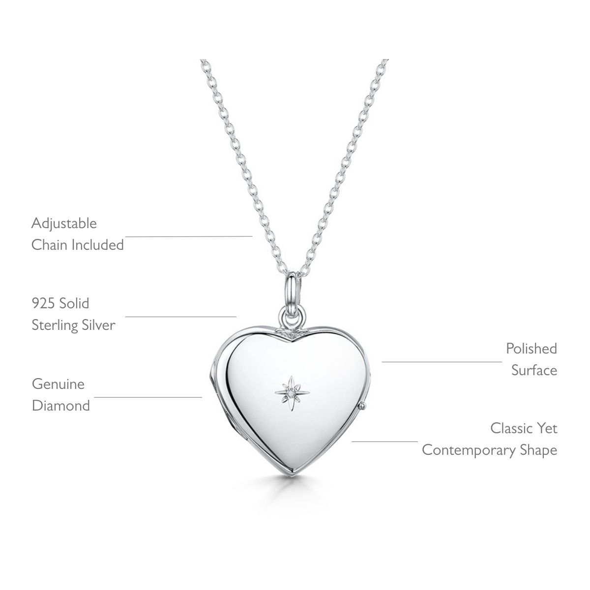 The locket is suspended from an adjustable 16–18 inch trace chain, with the option to upgrade to a longer 20, 22, or 24 inch adjustable chain to suit your style. Each chain is crafted from sterling silver.