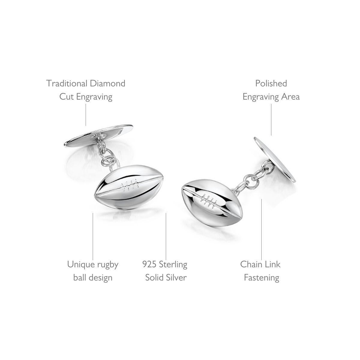 Solid 925 sterling silver Rugby Ball cufflinks with chain link fastening. These sporting cufflinks are made in England and are perfect for fans of the nation’s greatest game. The unique design is elevated by a personal engraving with the finest diamond-tipped cutters.