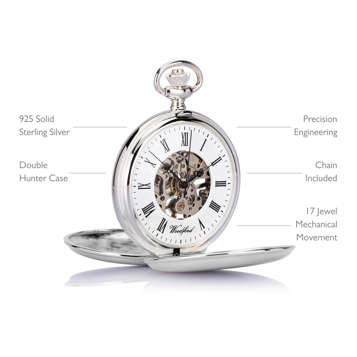 Solid sterling silver pocket watch, with double hunter skeleton case and 17 jewel mechanical movement. A beautiful timepiece from Woodford, speaking to all the sensibilities of a classic English pocket watch. The solid 925 silver twin-lidded case houses an exquisitely engineered precision movement, set against an elegant white outer dial displaying black Roman numerals, period hands and outer-minute indicators.