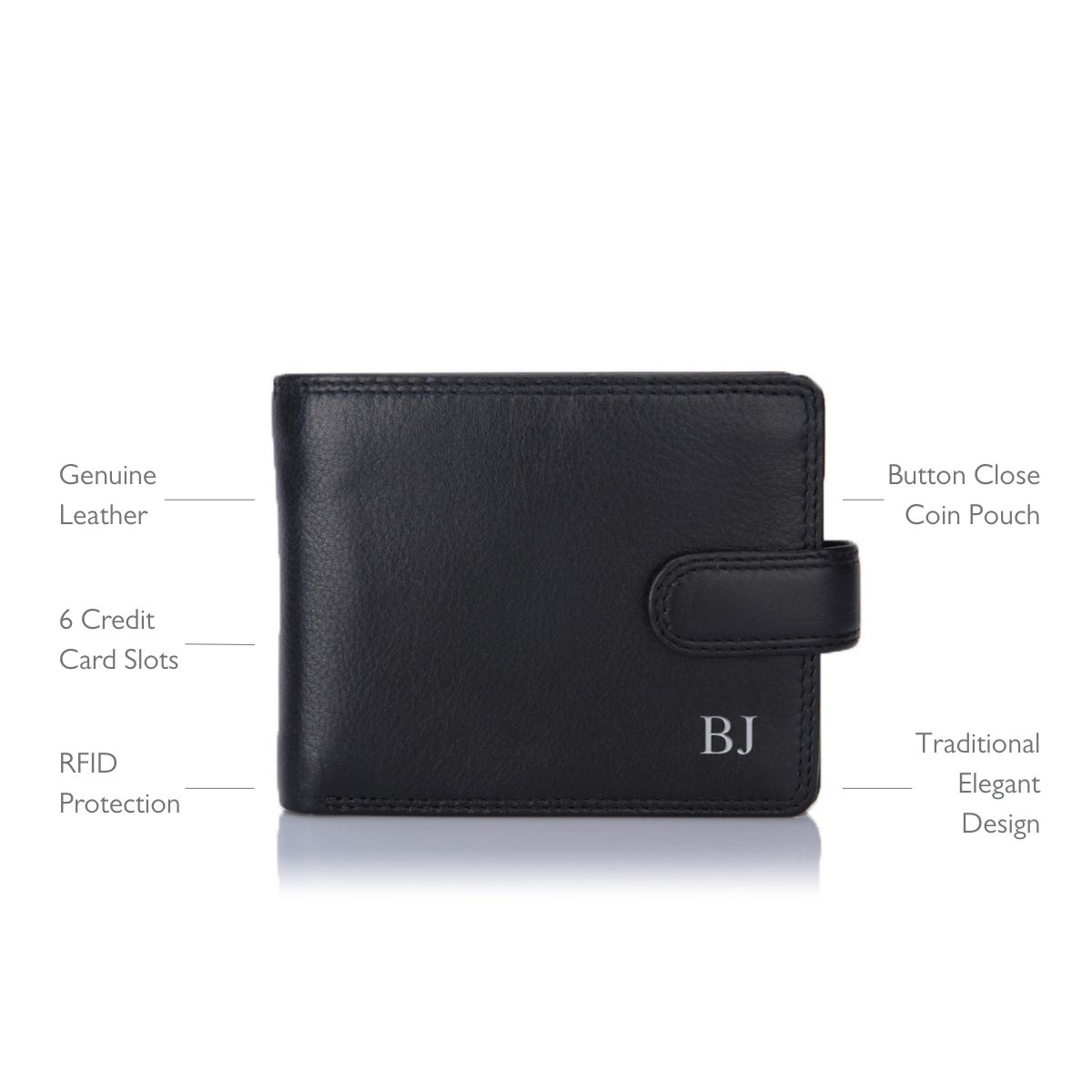 Premium black leather wallet, personalised with complimentary gold, silver or blind embossed initials. This custom wallet draws on London sensibilities and is designed for a life in the capital city. It features extensive compartments, including six credit card slots, a split note compartment, an ID window, three slip compartments and a button close coin pouch. The personalised wallet features RFID protection to keep personal data safe, and a Visconti lining is used throughout.
