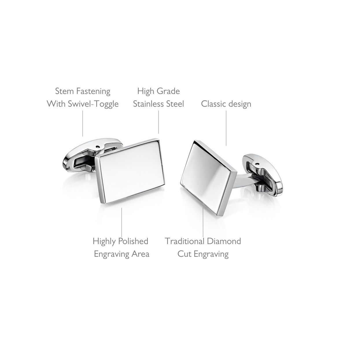 Stainless steel personalised cufflinks in classic oblong shape. Part of the Selective range by Engravers Guild of London, these personalised cufflinks have been included in the range for their superlative quality and beautiful finish. Featuring a brilliantly polished face for a custom inscription, the oblong cufflinks have a stem fastening with swivel-toggle. The engraving is made with the finest quality diamond-tipped cutter which creates a physical impression in the metal, producing an effect which will keep its lustre indefinitely.