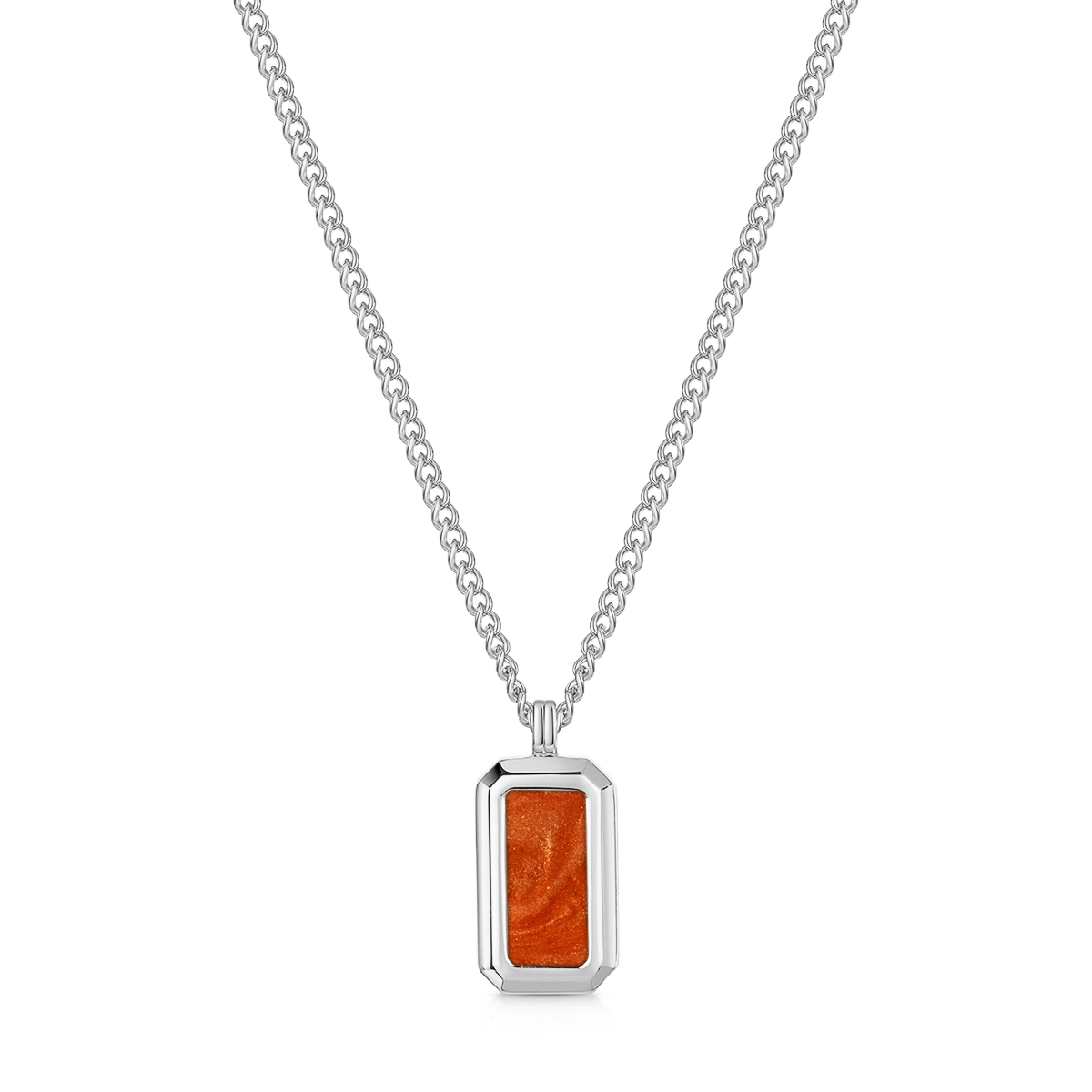 Crafted from solid 925 sterling silver, this necklace features a rectangular ingot pendant filled with cremation ashes suspended in coloured resin.
