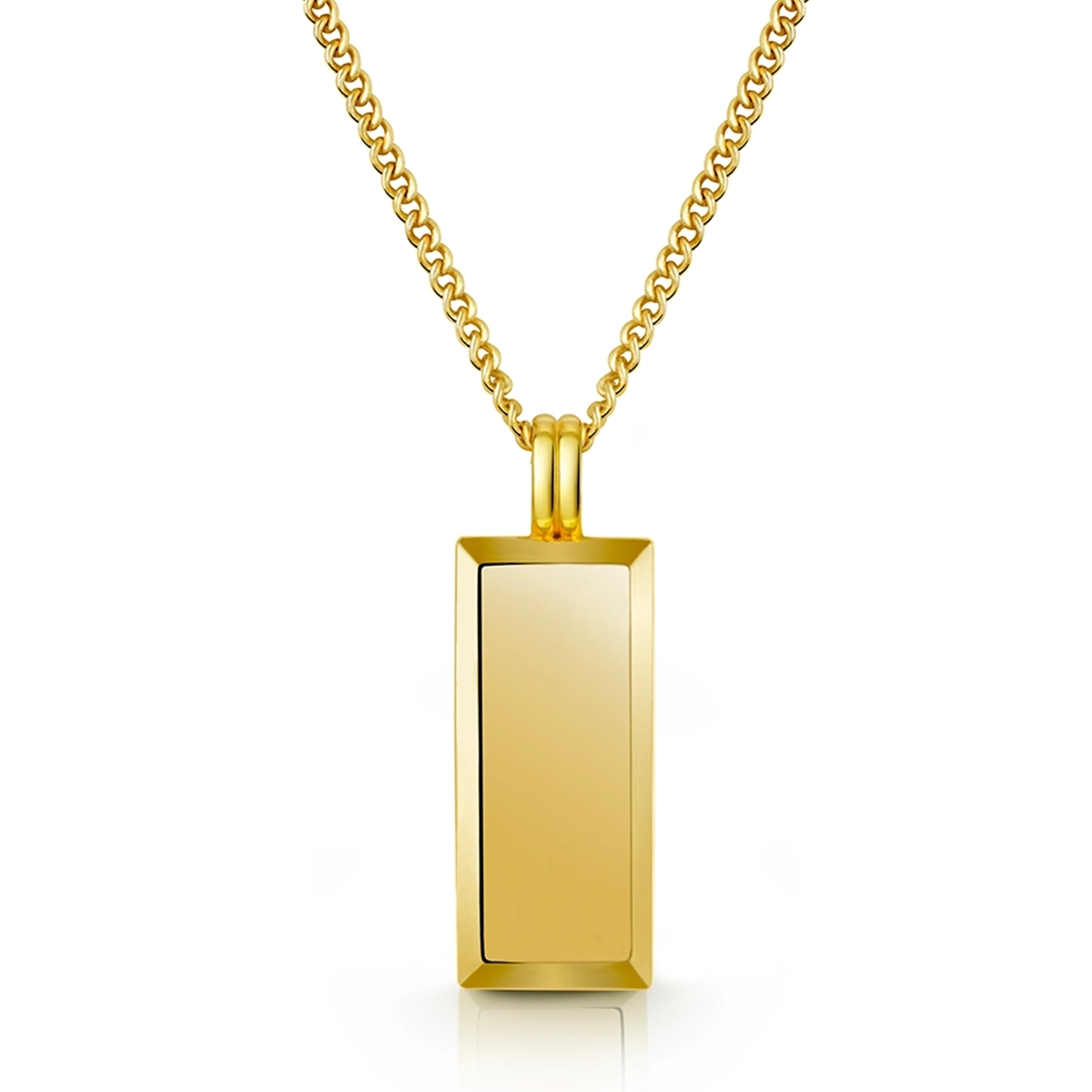Crafted in 925 sterling silver and plated in 18k gold, this men’s memorial necklace features a bold, elongated ingot-style pendant with clean architectural lines.