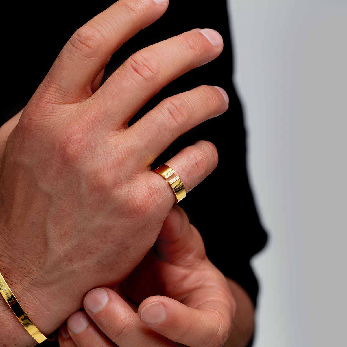 An ornate statement piece, the Crystal Split Band Personalised Ring is crafted from 925 sterling silver plated with 18K gold and finished with a high polish, featuring a group of decorative crystals at either end of the band. Personalise the ring with an engraving, whether it’s a special date, name, or initials. It will create a truly unique and sentimental piece. Packed in a luxury Clewley gift box, it makes the perfect gift for any discerning gentleman.