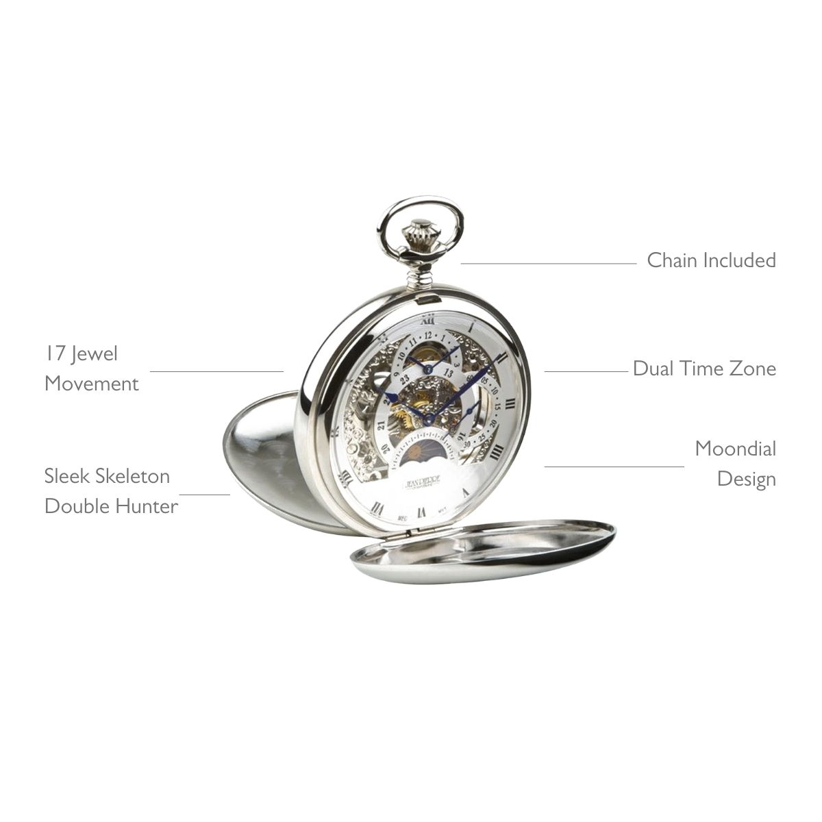 A superlative timepiece, the Jean Pierre skeleton pocket watch is an exquisite horological instrument and one of the most highly coveted available. The sleek skeleton case encloses a precision movement of the finest engineering, while the double hunter design showcases the craftsmanship through the front and back. Also featuring a ‘Moondial’ which shows an image of the sun in the daytime and the Moon at night.