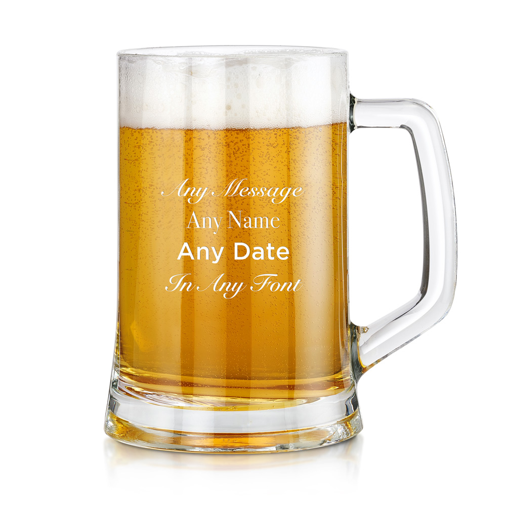 Classic British glass beer tankard for 1 pint. An enduring reference point for pubs across the British Isles, this traditional tankard holds a special place in drinking culture. Made of hardened glass, the sturdy piece is designed to last a lifetime and to serve as a keepsake of a notable occasion. Precision laser engraving finishes the glass, creating a very special gift.