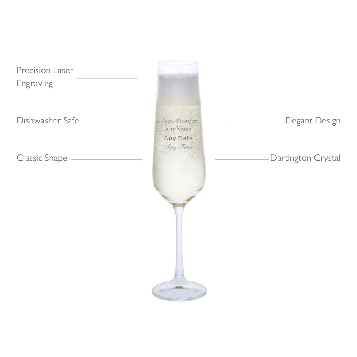Crystal flute champagne glass from Dartington Crystal. Crack open the Champagne, pour and enjoy! This lead-free crystal glass is robust enough for everyday use and dishwasher safe, whilst also sparkling for presentation purposes. The simple yet elegant design makes them an ideal choice when entertaining friends or family, especially when beautifully finished with personalised engraving.