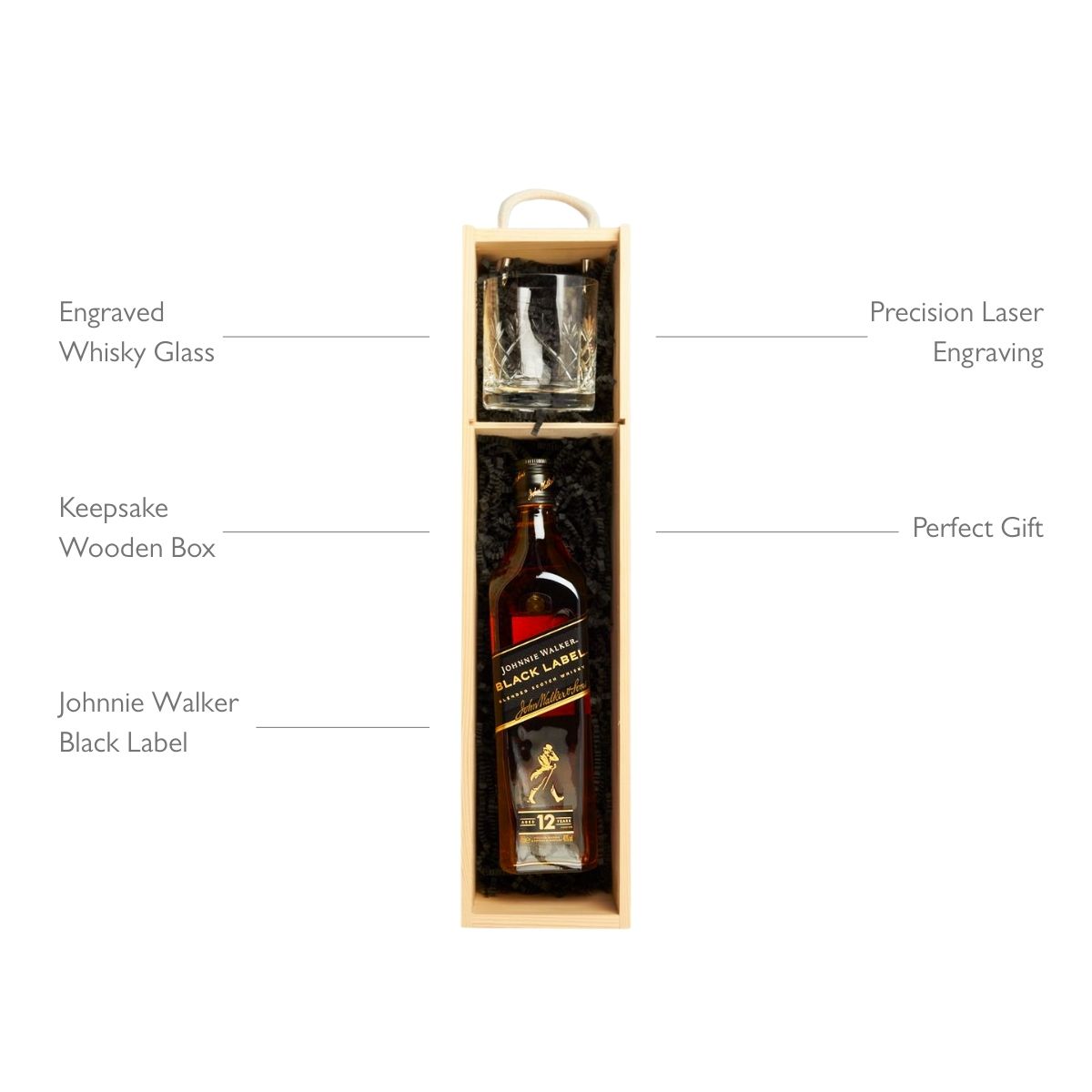 Create a cherished keepsake for the discerning whisky connoisseur by gifting a Johnnie Walker Black Label Whisky Bottle presented in a luxurious wooden box and a whisky glass engraved with a message of your choice. Johnnie Walker Black Label Blended Scotch Whisky is full of flavour with the volume turned up. Gold Medal Winner at the International Wine and Spirits Competition 2022.