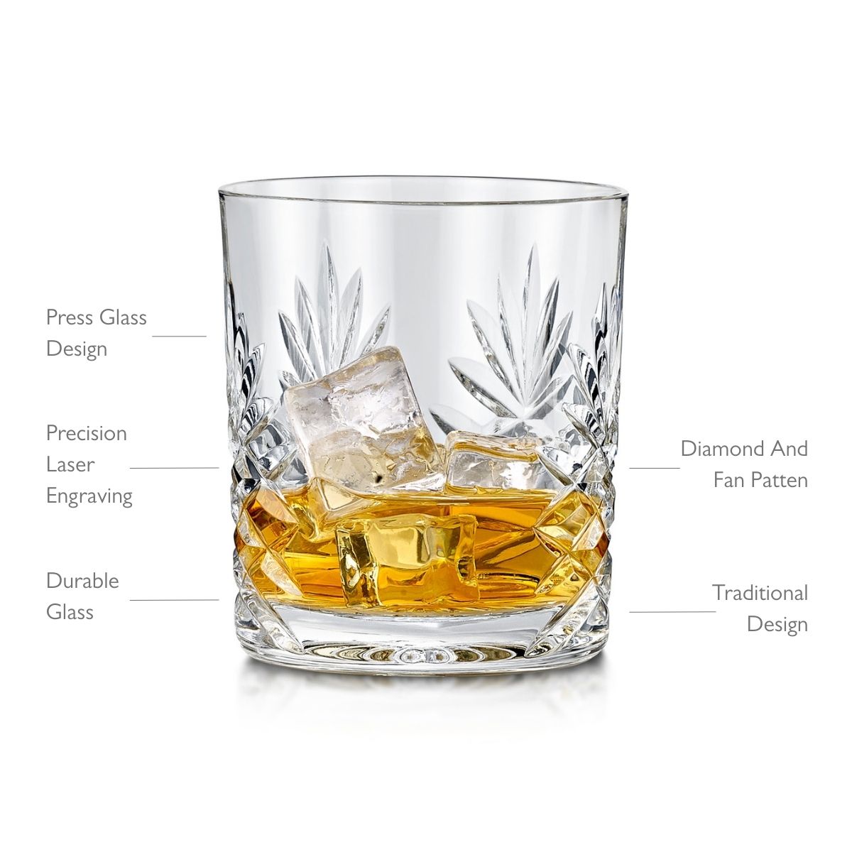 Personalised whisky tumbler with traditional press-glass design in a diamond and fan pattern. Made for durability, this timeless piece makes a perfect gift for everyday use or for a special occasion. Precision laser engraving cuts a beautiful impression, with the panel brilliantly showcasing a personalised message.