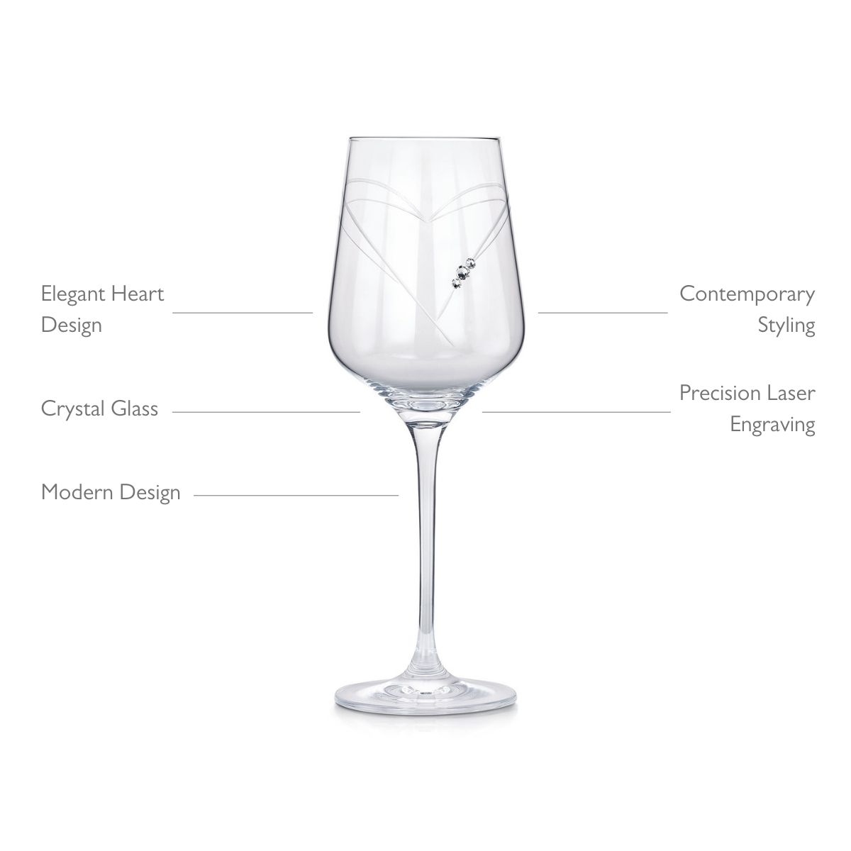 Premium quality crystal glass for wine, with an elegant heart design featuring 3 Swarovski crystals for an extra sparkle. This glass is ideal for romantic occasions. Precision laser engraving cuts a beautiful impression making the gift personal, and even more special.