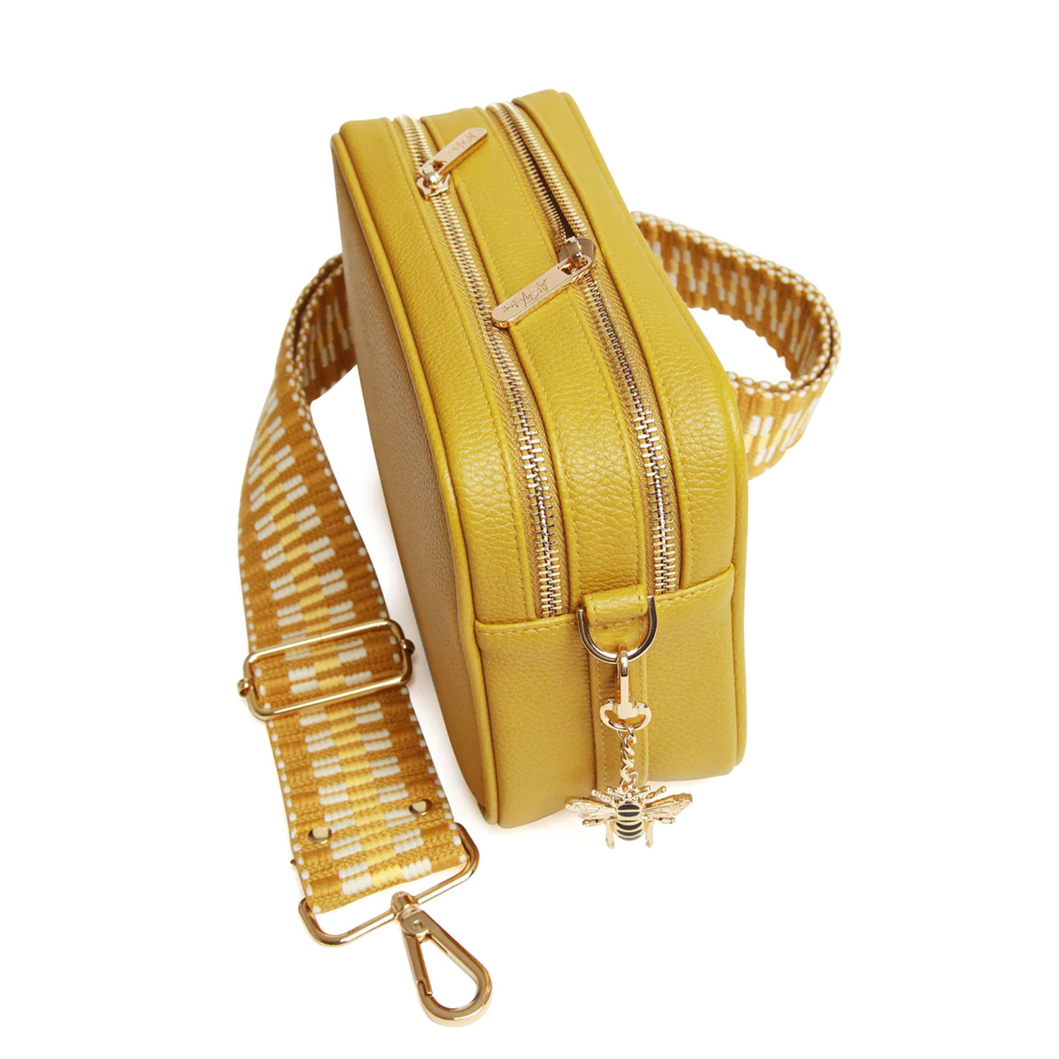 A spacious dual compartment bag in a bold yellow colour. This personalised bag provides easy hands-free convenience, perfect for any occasion. Twin main compartments secure with zip fastening and open to reveal matching interiors with plenty of room for all your items. Includes a handy internal zipped pocket to keep cards and small valuables safe and secure. Each bag includes both a stylish patterned strap and matching colour co-ordinated strap, fully adjustable for you to wear crossbody or over the shoulder. Engravers Guild will emboss the recipient’s initials to make this bag extra special.