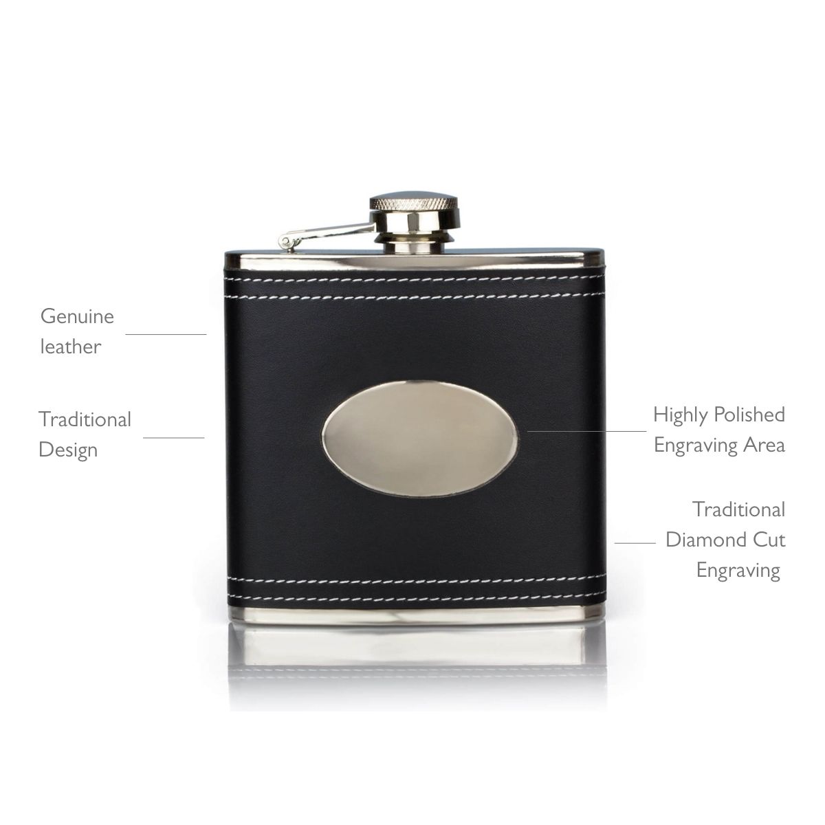 Leather hip flask personalised with custom engraving on stainless steel surface. The genuine real black leather beautifully sets off the metal chrome features and brings a tactile finish to a stunning men’s accessory which is engraved with the finest quality diamond-tipped cutter.