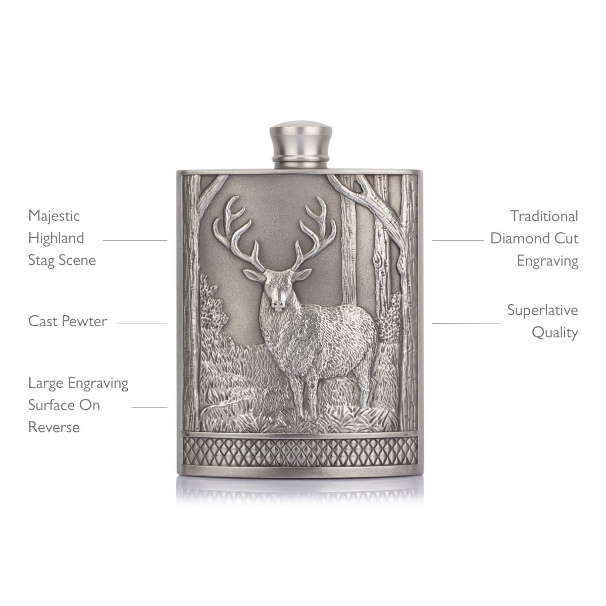A majestic 6 oz pewter hip flask with relief design of a noble stag. This personalised hip flask from Royal Selangor is a beautifully impressive piece, fashioned in cast pewter and designed to last through generations. A handsome stag is featured in a highland scene, with the imagery continuing onto the reverse of the hip flask. A large area for engraving is provided for, ideal for showcasing a diamond-cut inscription from Engravers Guild of London, creating a perfect commemorative gift.
