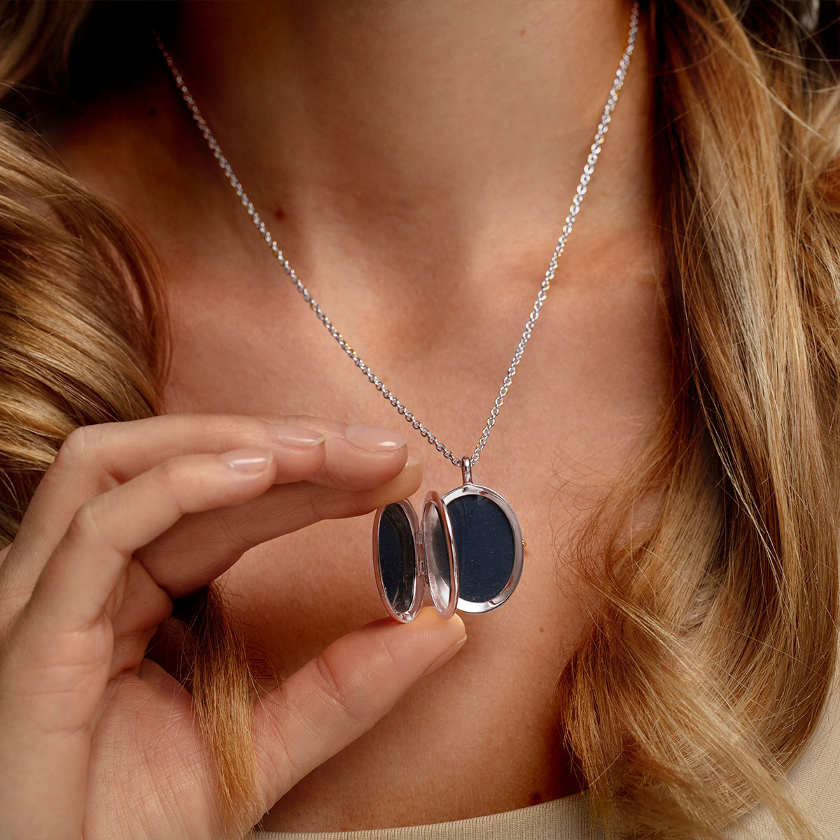 The personalised oval locket measures 18mm in width at the widest part, and 24mm in height. The locket is suspended from an adjustable 16–18 inch trace chain, with the option to upgrade to a longer 20, 22, or 24 inch adjustable chain to suit your style. Each chain is crafted from sterling silver.