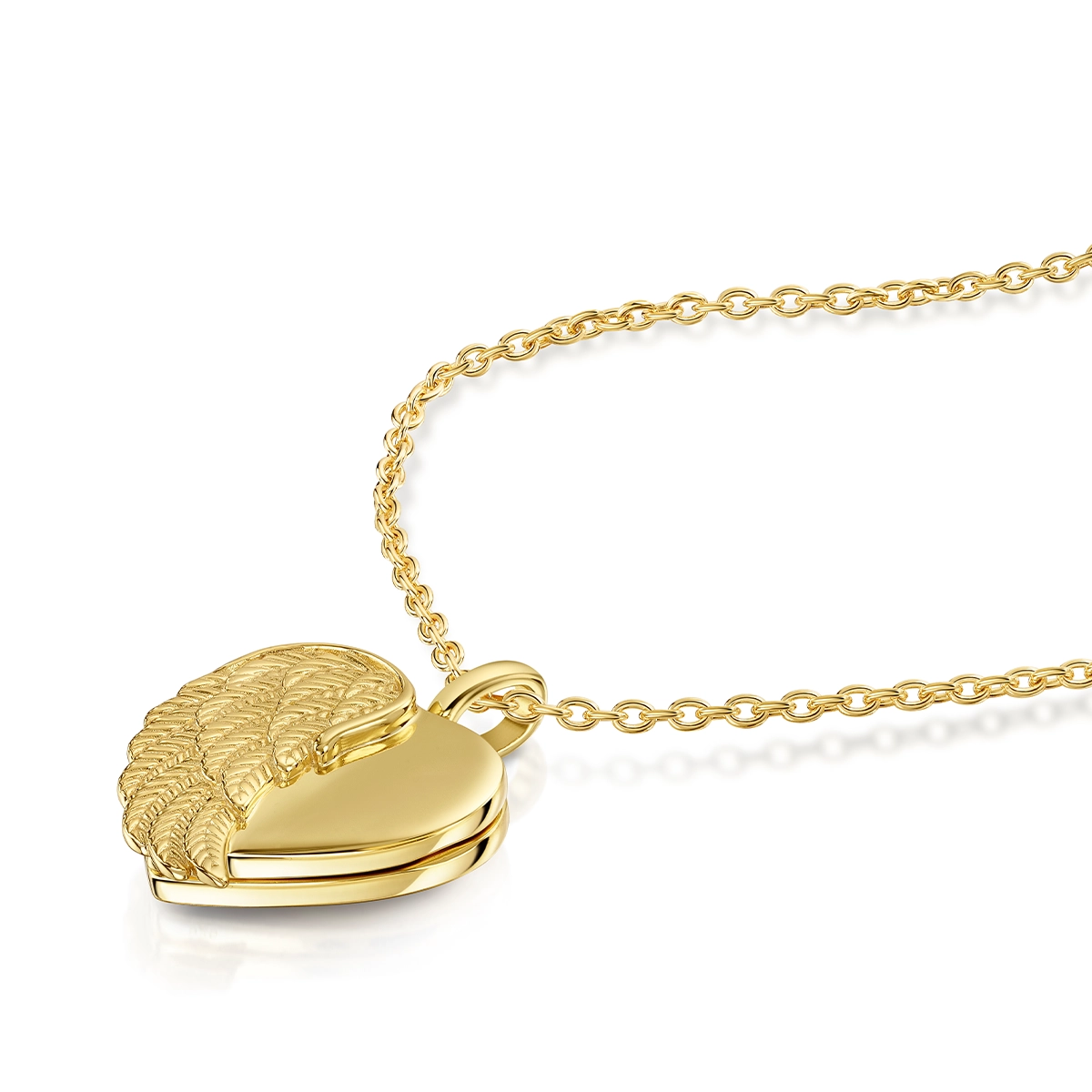 Crafted in 925 sterling silver and finished with 18k gold plating, this necklace features a heart-shaped locket accented with a sculpted angel wing.