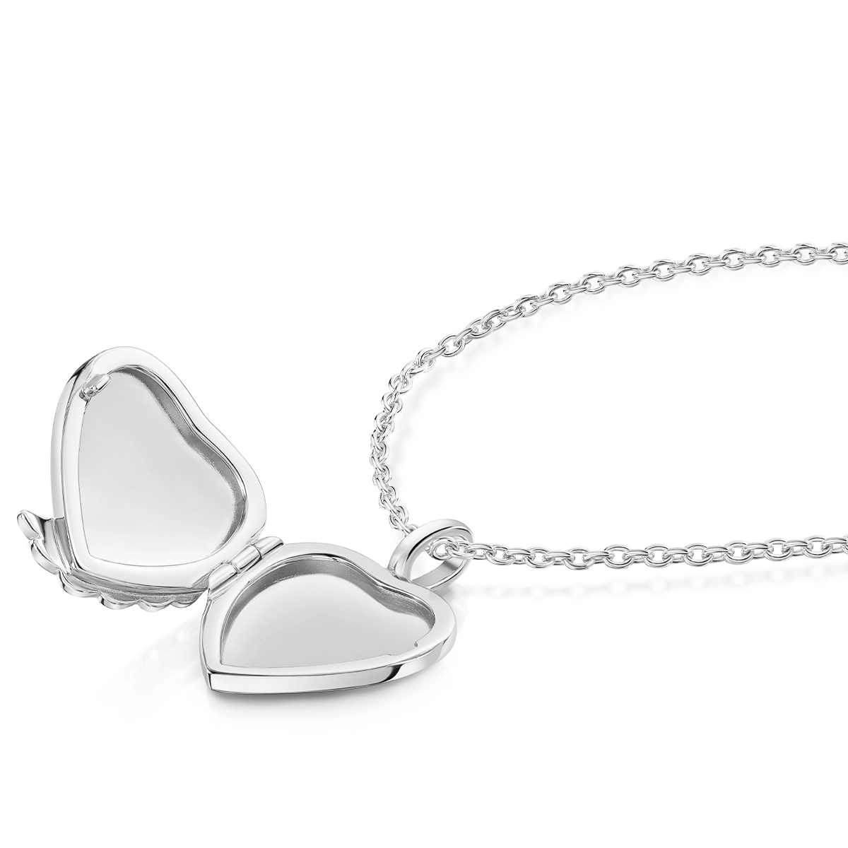 Crafted in 925 sterling silver, this necklace features a heart-shaped locket accented with a sculpted angel wing.