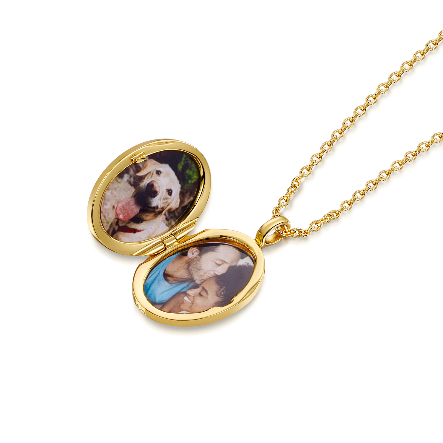 The personalised Gold Oval Locket measures 15mm wide, 20mm high and 5mm deep. The locket is suspended from an adjustable 16–18 inch trace chain, with the option to upgrade to a longer 20, 22, or 24 inch adjustable chain to suit your style. Each chain is crafted from sterling silver and plated with 18k gold.