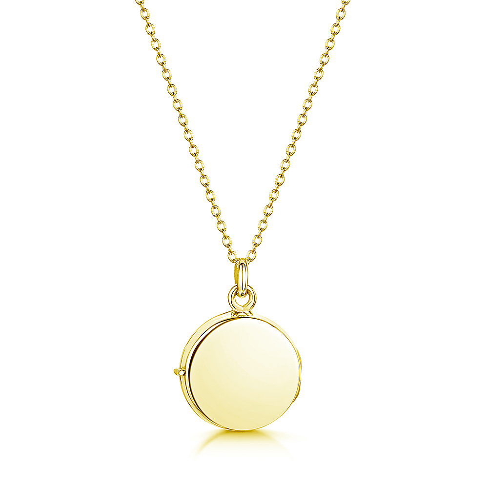 The custom engraved locket measures 14mm in diameter, 5mm in depth. The locket is suspended from an adjustable 16–18 inch trace chain, with the option to upgrade to a longer 20, 22, or 24 inch adjustable chain to suit your style. Each chain is crafted from sterling silver and plated with 18k gold.
