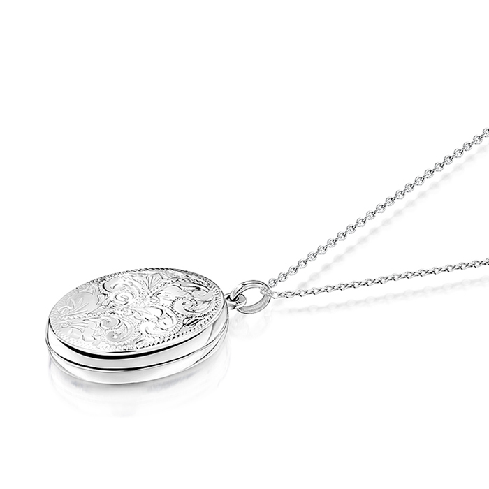 Large oval sterling silver locket with scroll engraving on front. The locket showcases the scroll engraving which a skilled artisan carved by hand, making a very special piece of personalised jewellery which is totally unique. This truly exquisite item seamlessly incorporates the flow of the hinge into the body of the locket, and the interior has space for a sizeable photo within each side.