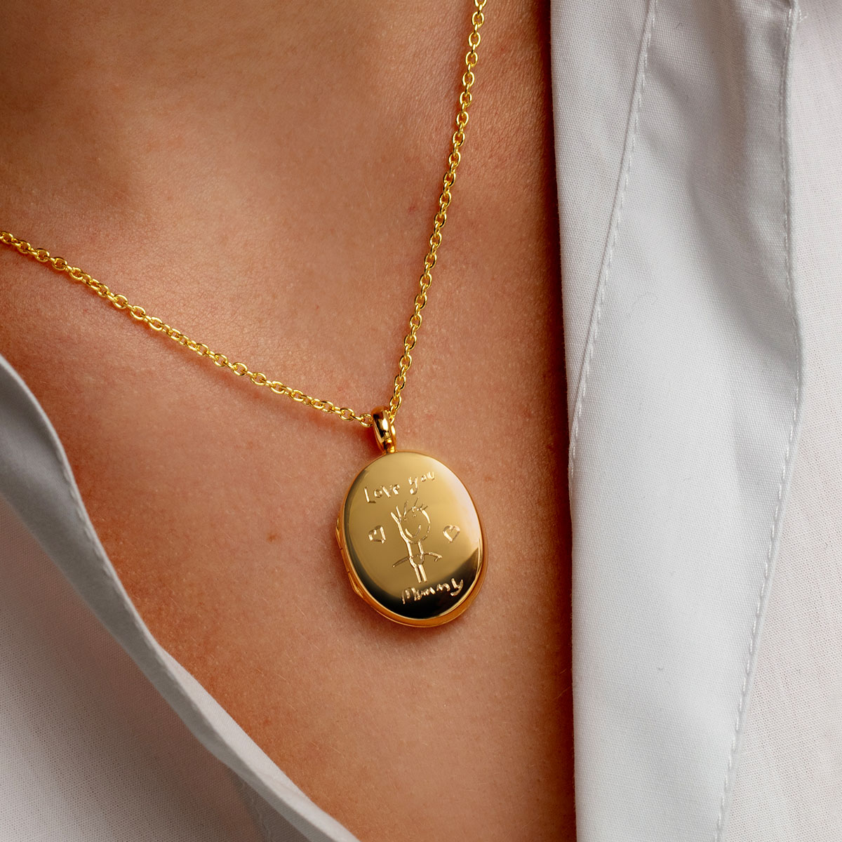 All engraving is carried out by one of our highly skilled engravers with a precision diamond-tipped cutter. The personalised oval locket measures 18mm in width at the widest part, and 24mm in height. The locket is suspended from an adjustable 16–18 inch trace chain, with the option to upgrade to a longer 20, 22, or 24 inch adjustable chain to suit your style. Each chain is crafted from sterling silver and plated with 18k gold.