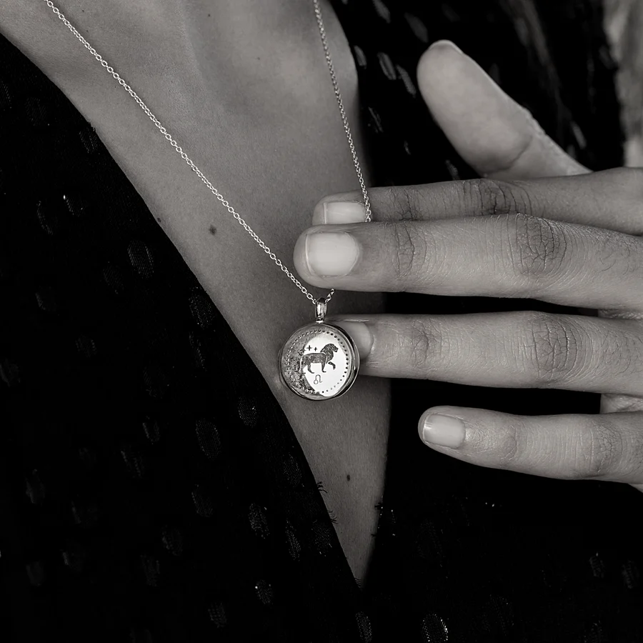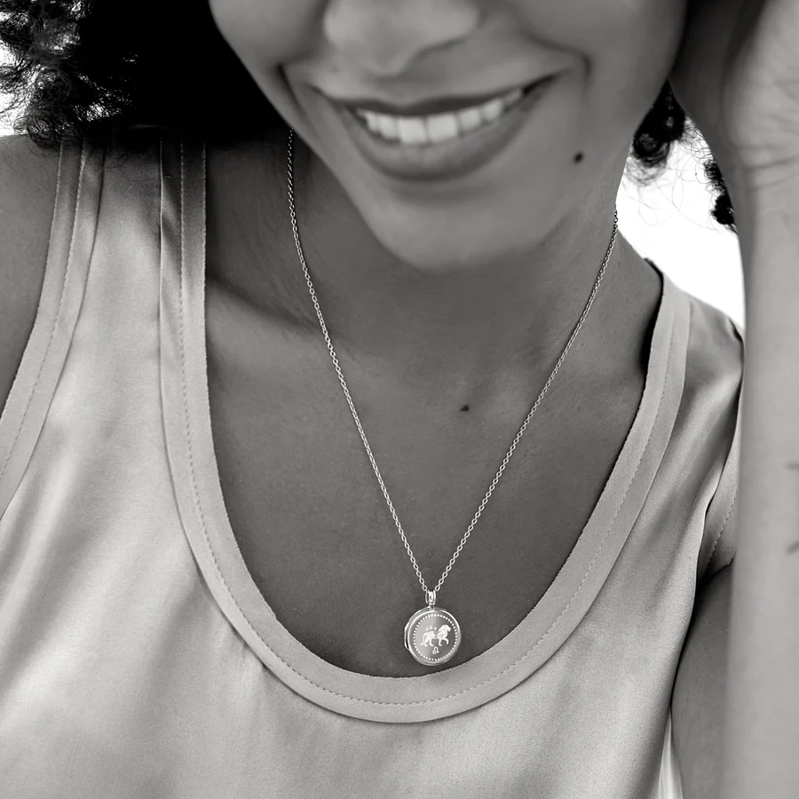 Beautiful round locket made of solid 925 sterling silver, featuring an engraved symbol of the Zodiac on the front. This piece from Lovelox boasts classic proportions, and is exquisitely finished to offer a necklace of superior quality. The hinge is expertly integrated into the line of the locket, thus barely breaking the flow of the circle. Personalised by Engravers Guild of London, this item of jewellery is designed to last as an extremely special gift for many years to come.