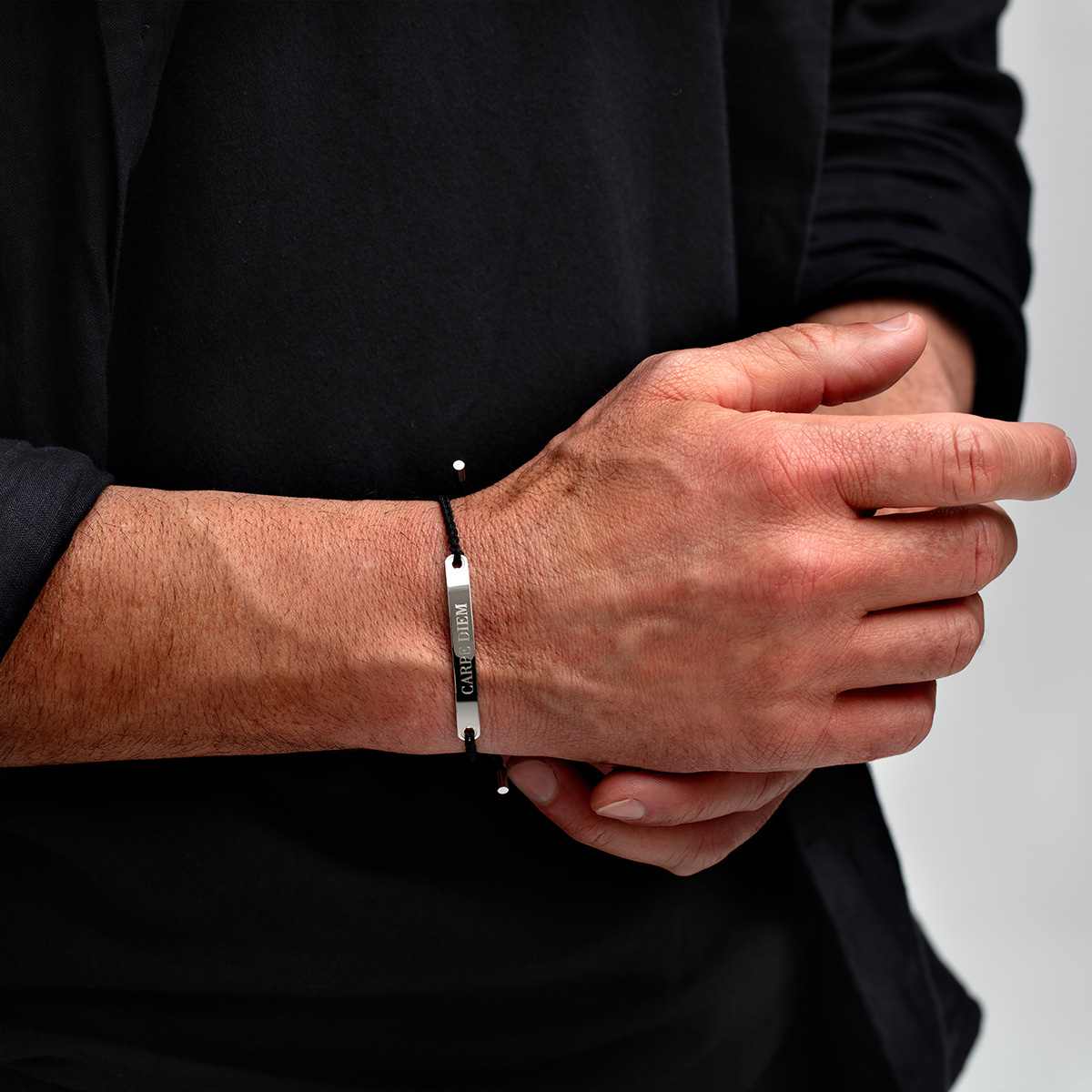 A timeless accessory, the Friendship Plate Bracelet from Clewley is crafted from stainless steel and paired with a woven black nylon cord, ensuring a durable bracelet for everyday wear. The stainless steel slider allows for easy adjustment of the bracelet length, while the stainless steel stoppers ensure a secure and comfortable fit.