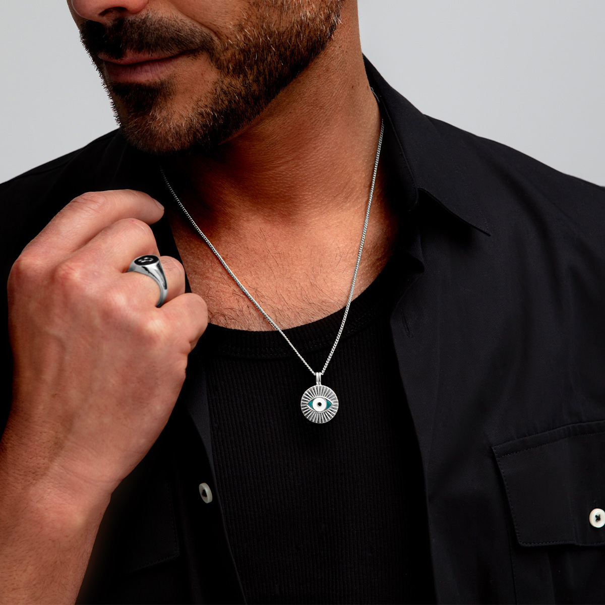 A captivating piece with symbolism, the Eye of Providence and chain from Clewley are crafted from 925 sterling silver and adorned with emerald, white, and black enamel.